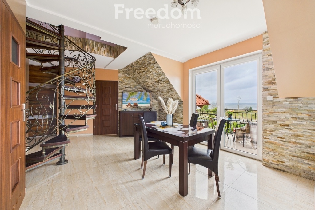 Apartament znajduje się na II piętrze i wyróżnia się funkcjonalnym układem: na dolnym poziomie mieści się salon z aneksem kuchennym, sypialnia, łazienka z prysznicem oraz balkon z pięknym widokiem na panoramę Zalewu Wiślanego, natomiast na piętrze znajdują się dwie przytulne sypialnie.