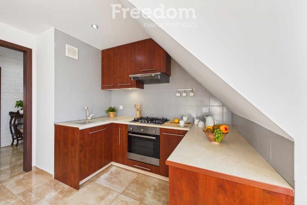 Dużym atutem jest kuchnia z wyraźnie wydzielona strefą do gotowania i przygotowywania posiłków. To rozwiązanie doceni każdy, kto lubi gotować lub po prostu chce zachować porządek. Ciekawym i jednocześnie praktycznym udogodnieniem jest dodatkowe pomieszczenie, które może pełnić rolę spiżarni lub pojemnej szafy.