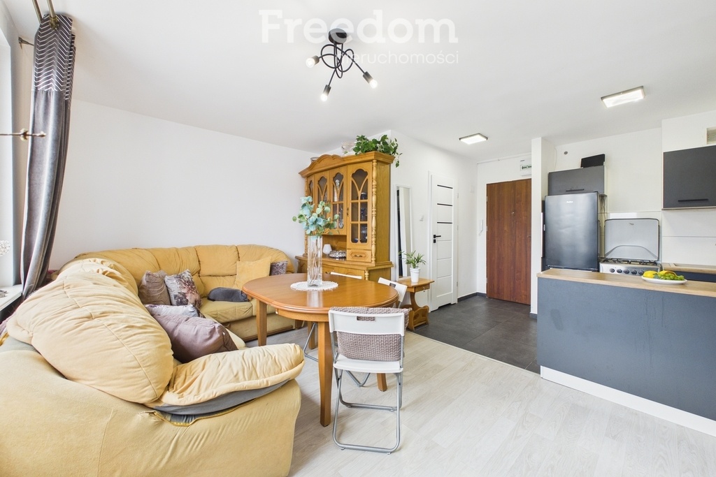 Przemyślany układ pomieszczeń sprawia, że przestrzeń jest maksymalnie wykorzystana. Jasny salon z aneksem kuchennym tworzy komfortową strefę dzienną – idealną zarówno do odpoczynku, jak i spotkań. Kuchnia została wyposażona w zabudowę oraz sprzęt AGD: lodówkę, zmywarkę, piekarnik i płytę elektryczną, co pozwala na wygodne użytkowanie od pierwszego dnia.