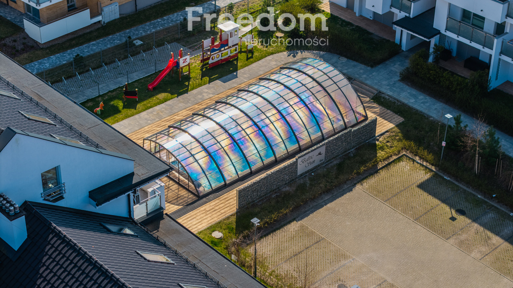 Posesja ogrodzona, bezpieczna i zagospodarowana. Do wyłącznego użytku dla mieszkańców mamy miejsca parkingowe, plac zabaw oraz zewnętrzny kryty basen.