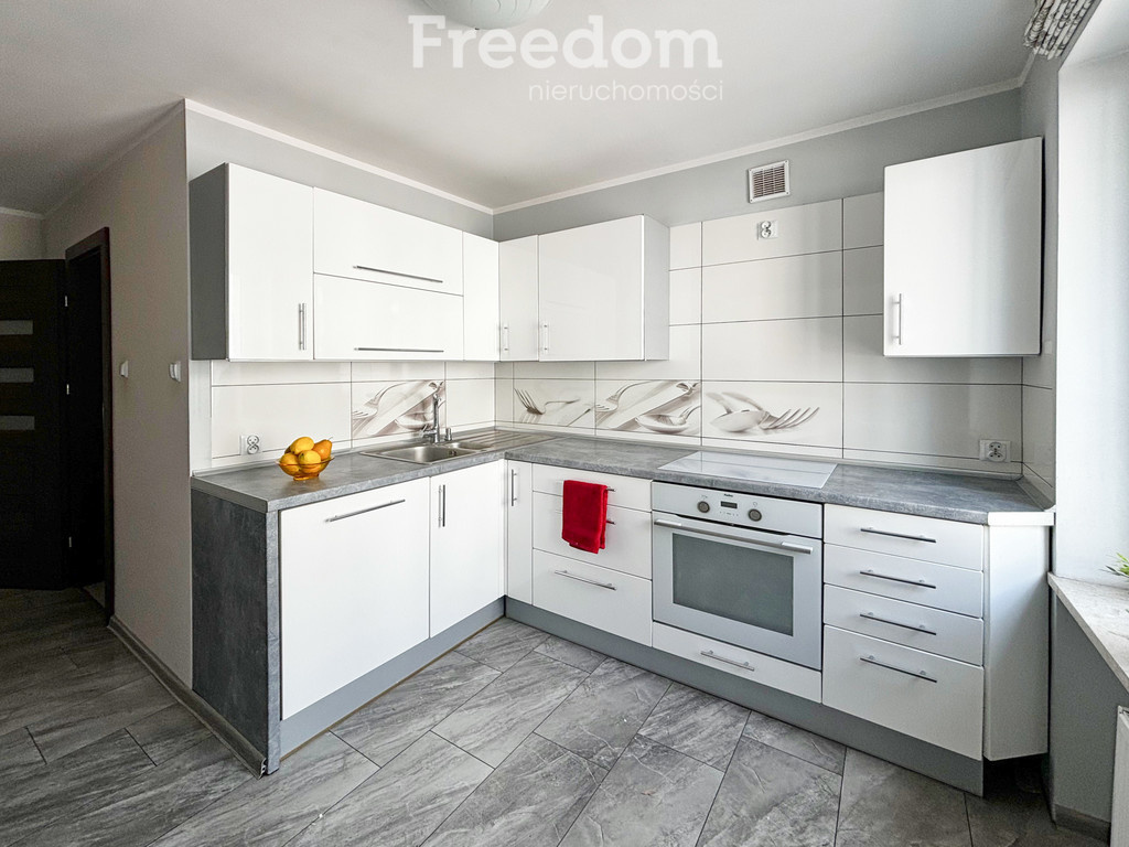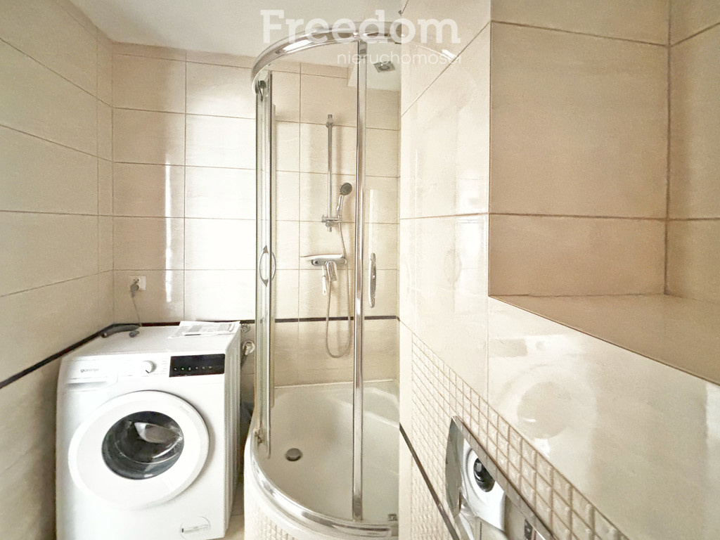 Meble w kuchni wraz ze sprzętami AGD to lodówka z zamrażarką, kuchenka elektryczna, piekarnik, okap kuchenny. W łazience znajduje się kabina prysznicowa, umywalka i wc.