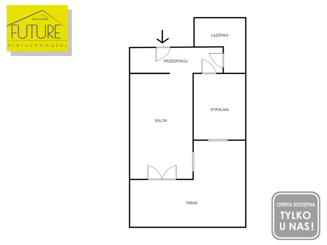 Składa się z salonu z aneksem kuchennym i wyjściem na taras, przedpokoju z szafą w stałej zabudowie, pokoju i łazienki.