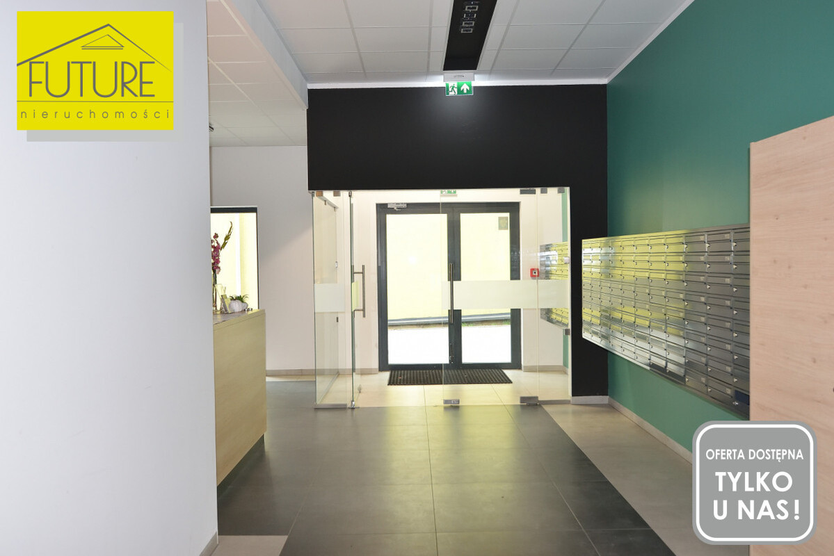 W budynku znajdują się dwie windy, recepcja oraz system monitoringu.