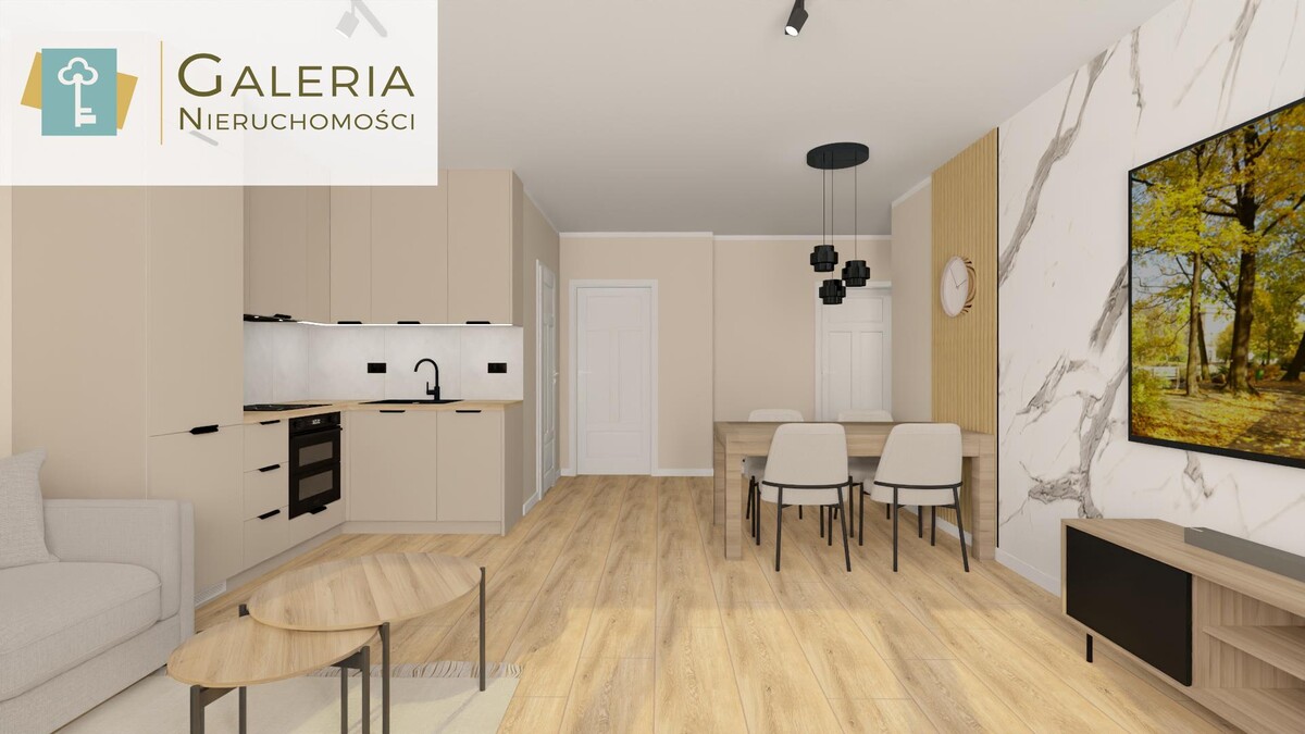 - Przestronny salon z wyjściem na balkon idealne miejsce na relaks z widokiem na zieleń oraz aneksem kuchennym zaprojektowanym w nowoczesnym, jasnym stylu
