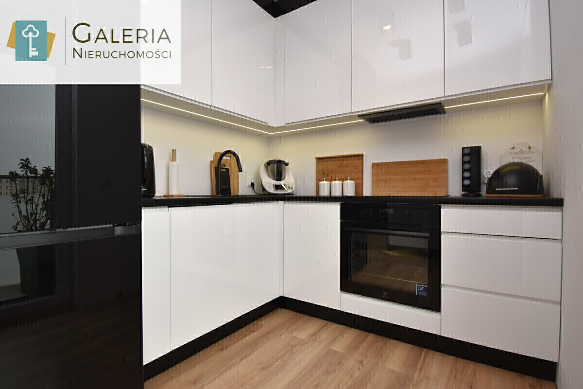 W kuchni znajdziemy zabudowę wykonaną na wymiar z pełnym wyposażeniem AGD - lodówka, płyta indukcyjna, piekarnik, okap. Funkcjonalności kuchni dodaje wyspa. Duże okna w salonie zapewniają mnóstwo naturalnego światła, tworząc jasną i przyjemną przestrzeń do wypoczynku. W salonie znajduje się duży stół z krzesłami oraz wygodna narożna kanapa.