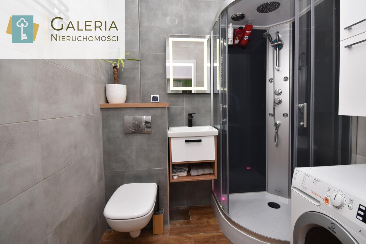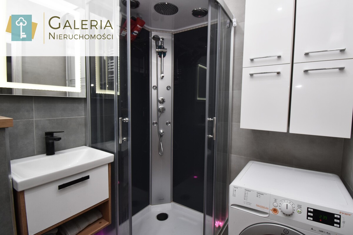 - łazienka po generalnym remoncie (październik 2024): kabina prysznicowa z hydromasażem, pralko-suszarka, nowoczesna zabudowa,