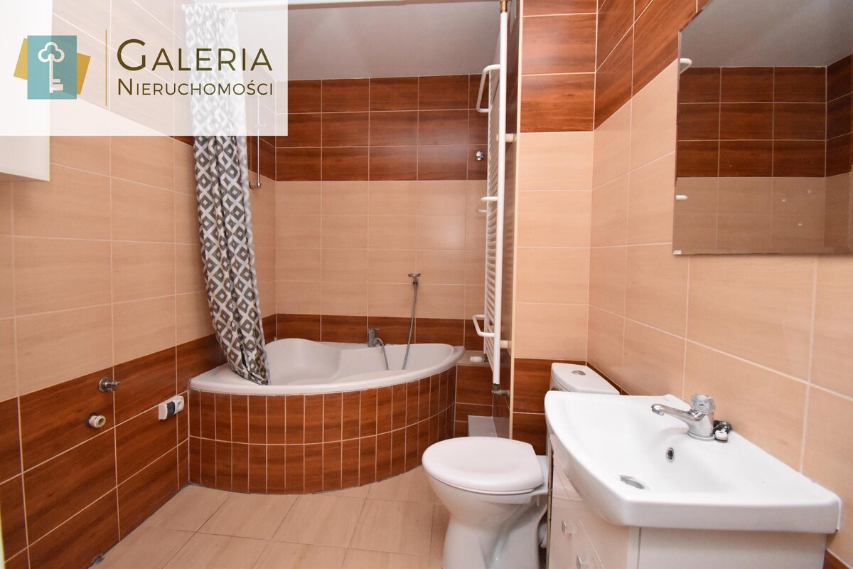 Łazienka wyposażona jest w narożną wannę, WC oraz miejsce na niezbędne sprzęty, zapewniając wygodę codziennego użytkowania.