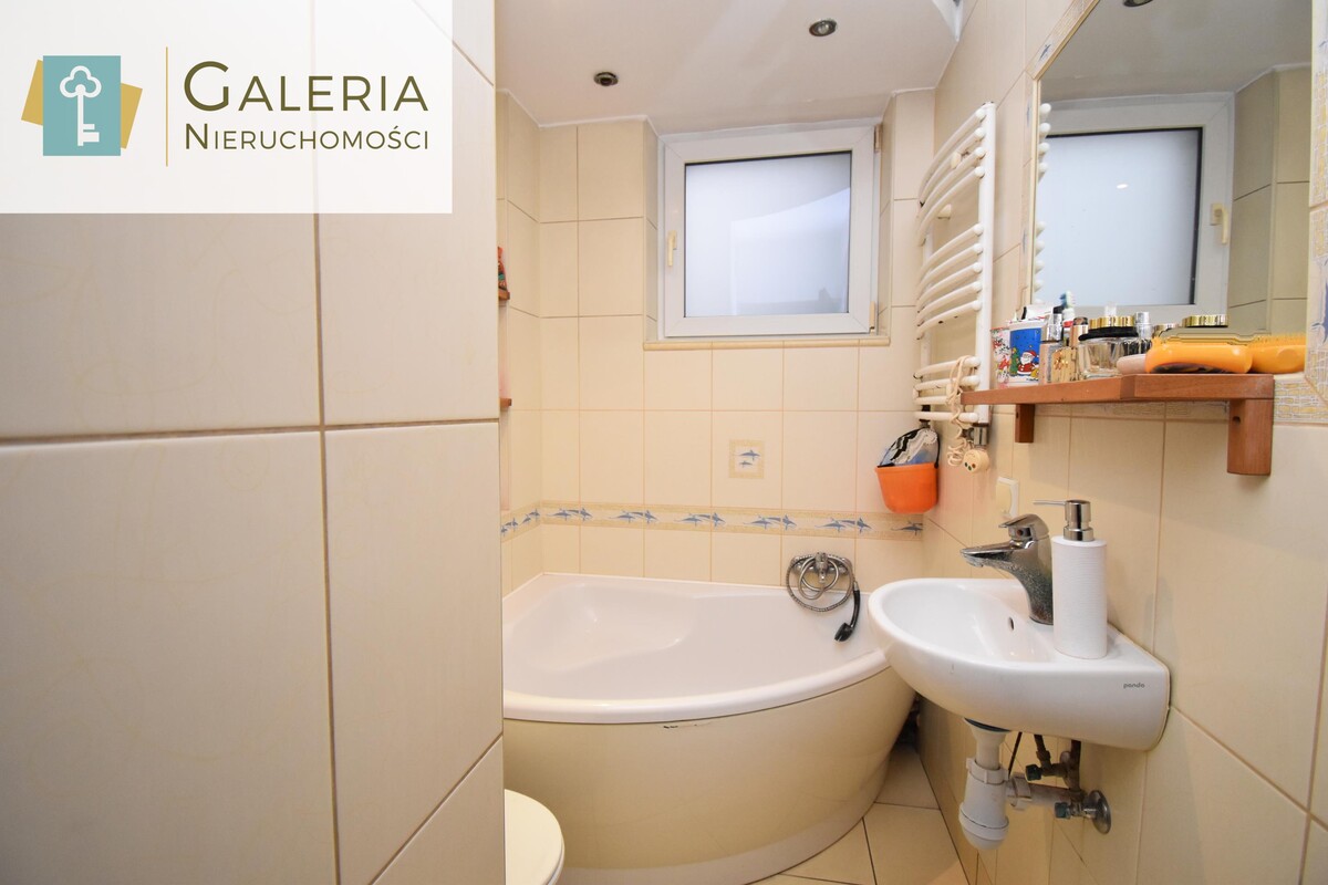 - Łazienka z wanną, umywalką i WC.