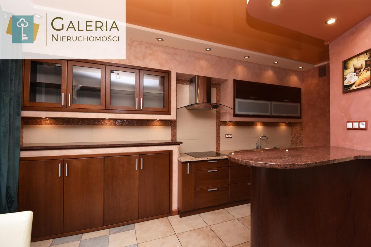 W kuchni i łazience zastosowano blaty z naturalnego granitu, fronty fornirowane drewnem, a całość dopełnia napinany sufit z efektownym oświetleniem LED.