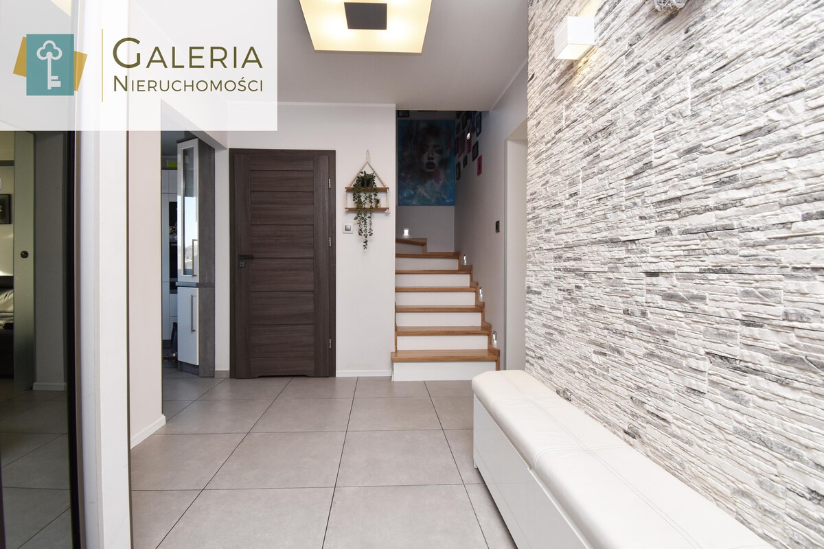 - duży przedpokój z szafą w zabudowie oraz eleganckie, drewniane schody prowadzące na górną kondygnację.