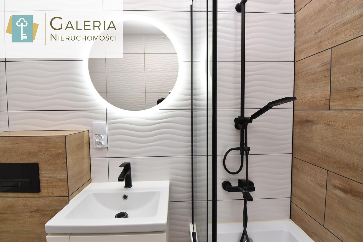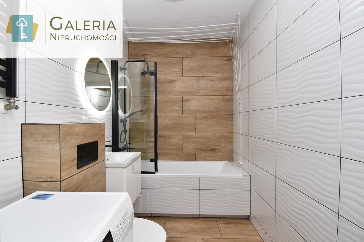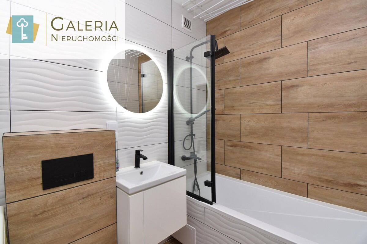 Elegancka i stylowa z wanną oraz parawanem prysznicowym, WC, umywalką z szafką i podświetlanym lustrem. Całość w modnych odcieniach bieli, drewna i czerni.
