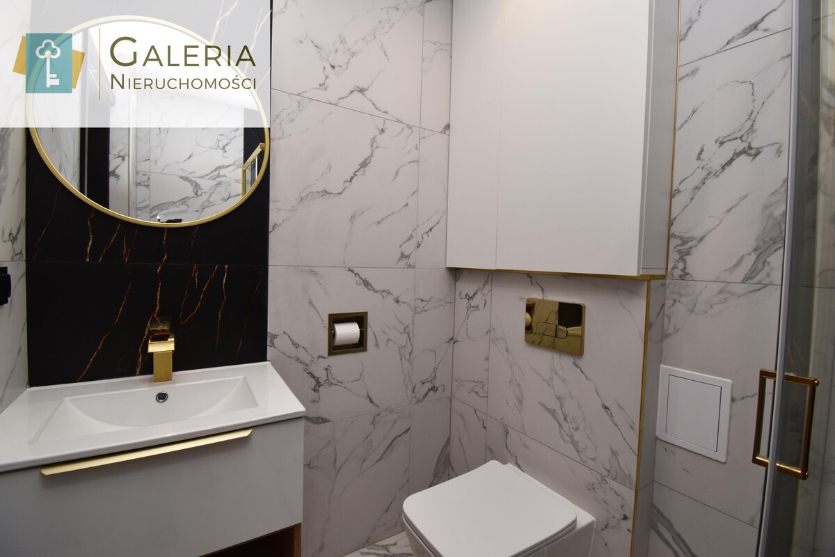 Łazienka urządzona z klasą marmurowe płytki, czarne i złote akcenty, podwieszana szafka, prysznic walk-in z elegancką armaturą.