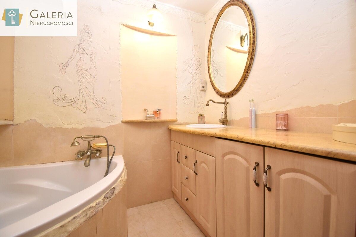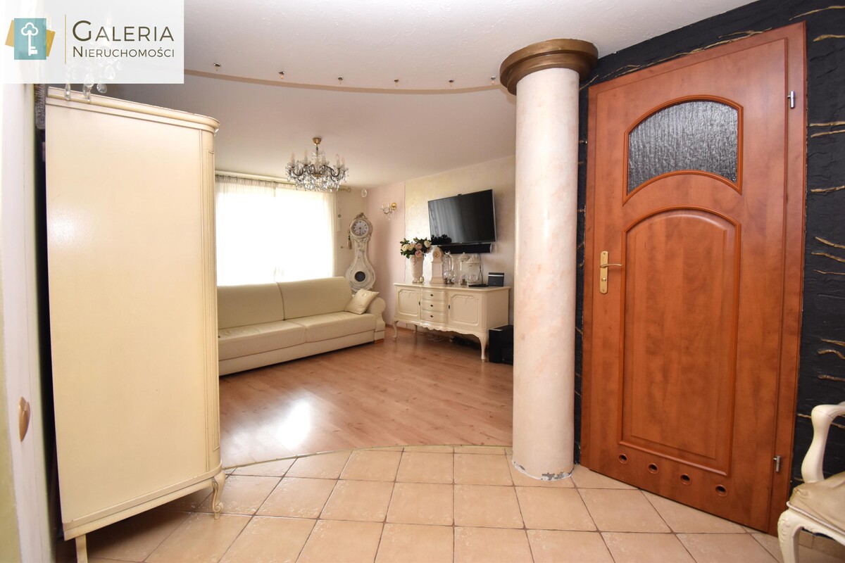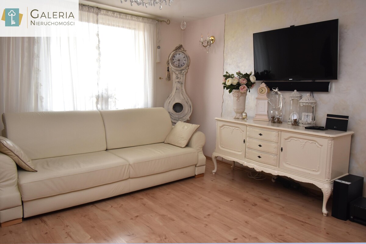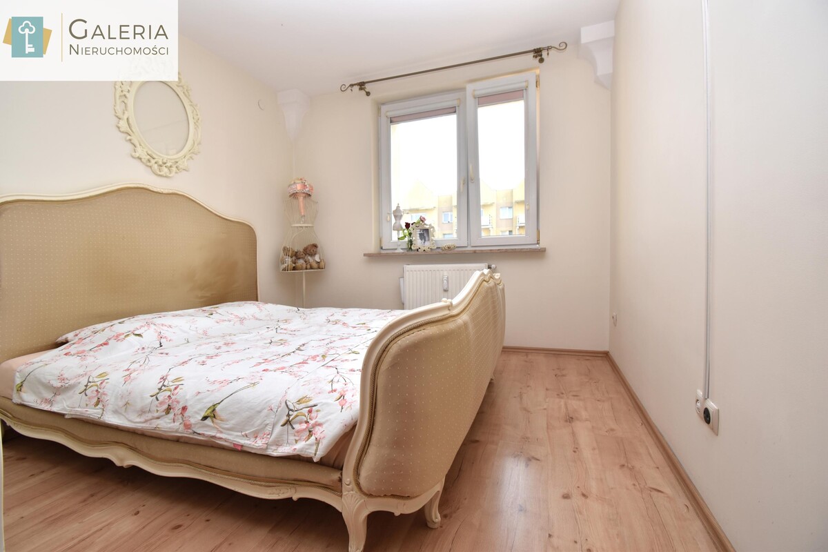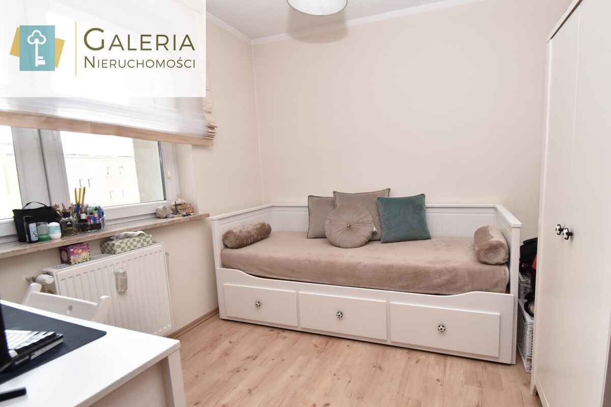 Lokal posiada dwustronną wystawę okien, dzięki czemu wnętrza są dobrze doświetlone przez cały dzień. Otwarta przestrzeń łącząca salon z kuchnią oraz wygodne przejście do przedpokoju tworzą funkcjonalny układ, który zapewnia komfort codziennego życia. Kuchnia została wyposażona w zabudowę kuchenną oraz niezbędne sprzęty AGD. W łazience znajduje się wanna, szafka z umywalką, duże lustro oraz pralka. Z przedpokoju prowadzi wejście do dwóch niezależnych pokoi sypialni z łóżkiem i pojemną szafą oraz pokoju dziecięcego. Wszystkie media dostarczane są z sieci miejskiej. Do mieszkania przynależy również duża piwnica o powierzchni około 8 m².