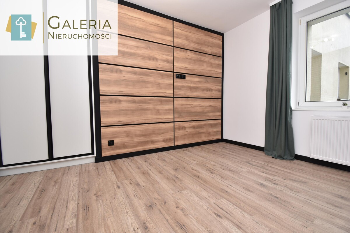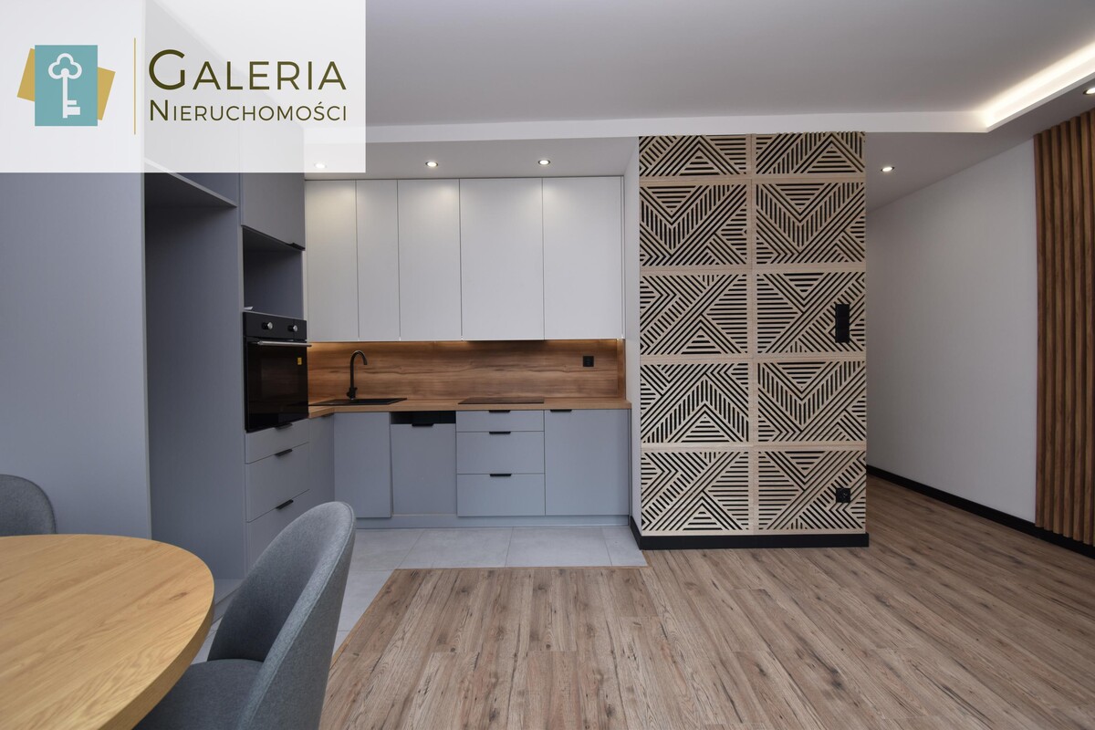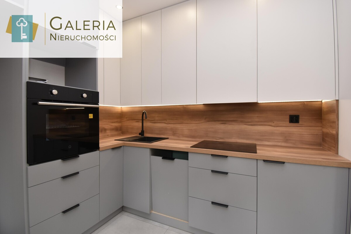 Wnętrze zaprojektowane w nowoczesnym stylu z dbałością o każdy szczegół. Kuchnia w zabudowie została wyposażona w piekarnik i płytę indukcyjną. Przygotowano również miejsce pod zmywarkę, lodówkę w zabudowie i mikrofalówkę.