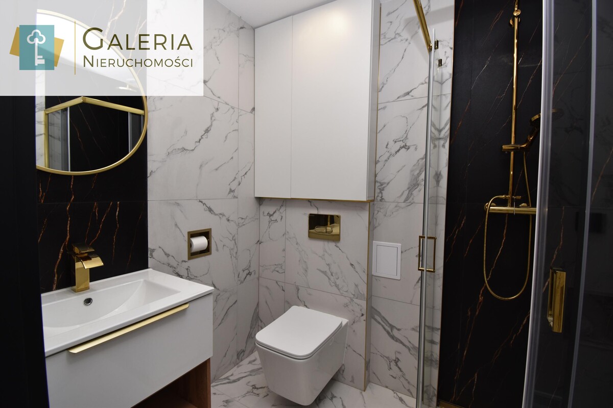 Łazienka urządzona z klasą marmurowe płytki, czarne i złote akcenty, podwieszana szafka, prysznic walk-in z elegancką armaturą.