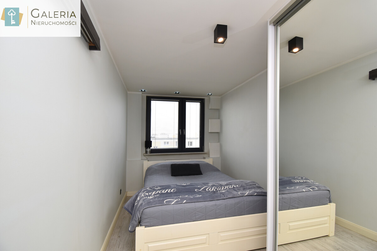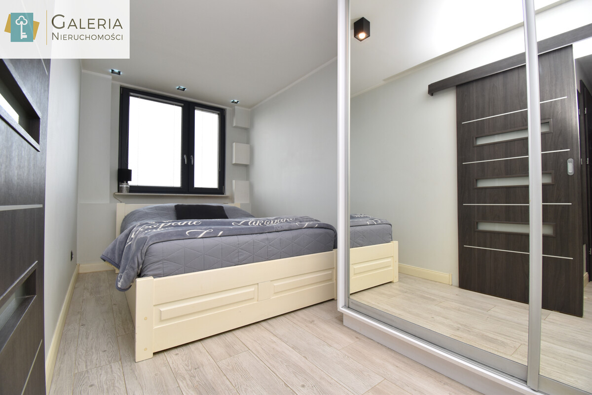 W sypialni znajdziemy pojemną szafę z lustrami oraz komfortowe łóżko.