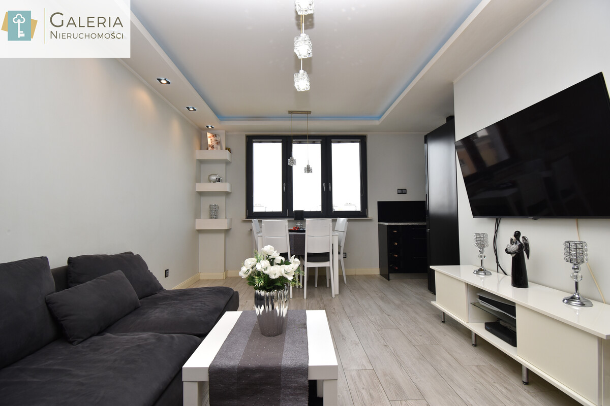 Salon połączony z kuchnią w której meble zostały wykonane na wymiar z zastosowaniem granitowych blatów oraz wyposażona jest w niezbędne sprzęty AGD (piekarnik, lodówka, płyta indukcyjna). Przestronny salon w którym znajduje się wygodny narożnik, a także rozkładany stół z krzesłami, szafka RTV. Sufit w salonie jest podwieszany i ma zamontowane dodatkowe oświetlenie halogenowe oraz led.