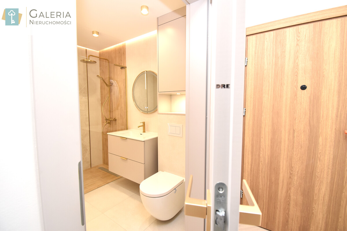 W pełni wykończona, w neutralnych i nowoczesnych barwach. Komfortowy prysznic, podświetlane lustro, zabudowa na chemię domową. Jasne płytki i złote dodatki tworzą spójną, luksusową całość.