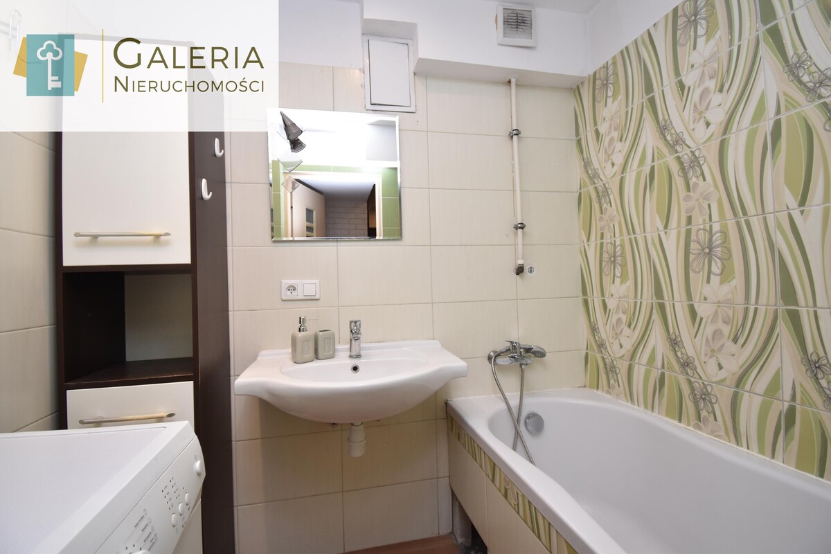 - łazienka z wanną, szafką łazienkową oraz pralką,