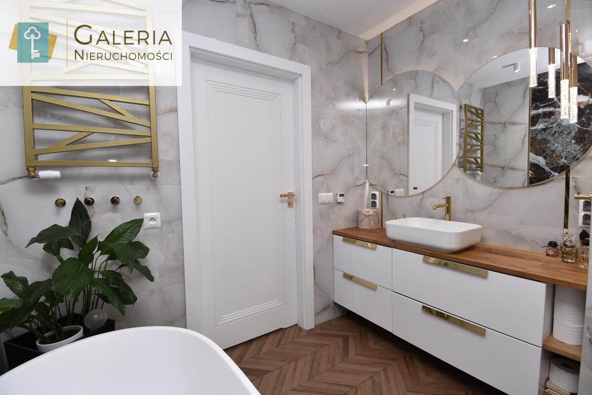 Pierwsza łazienka: Nowoczesna i elegancka, wyposażona w wolnostojącą wannę ze złotą armaturą. Podświetlane lustra LED oraz praktyczna zabudowa. Ogrzewanie podłogowe.