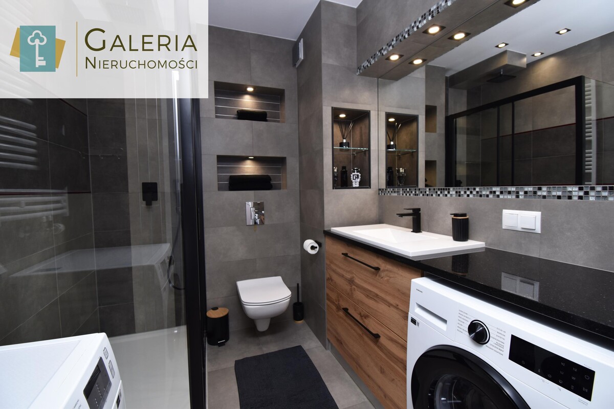 Druga łazienka: Komfortowa i funkcjonalna, z dużą kabiną prysznicową. Zabudowa mieszcząca pralkę i suszarkę. Oświetlenie LED i ogrzewanie podłogowe.