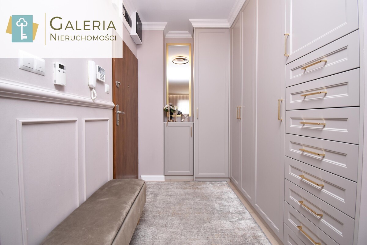Reprezentacyjna przestrzeń wejściowa z nowoczesną zabudową, dużym lustrem oraz eleganckimi, złotymi wykończeniami. Pojemna szafa w zabudowie zapewnia wygodę przechowywania.