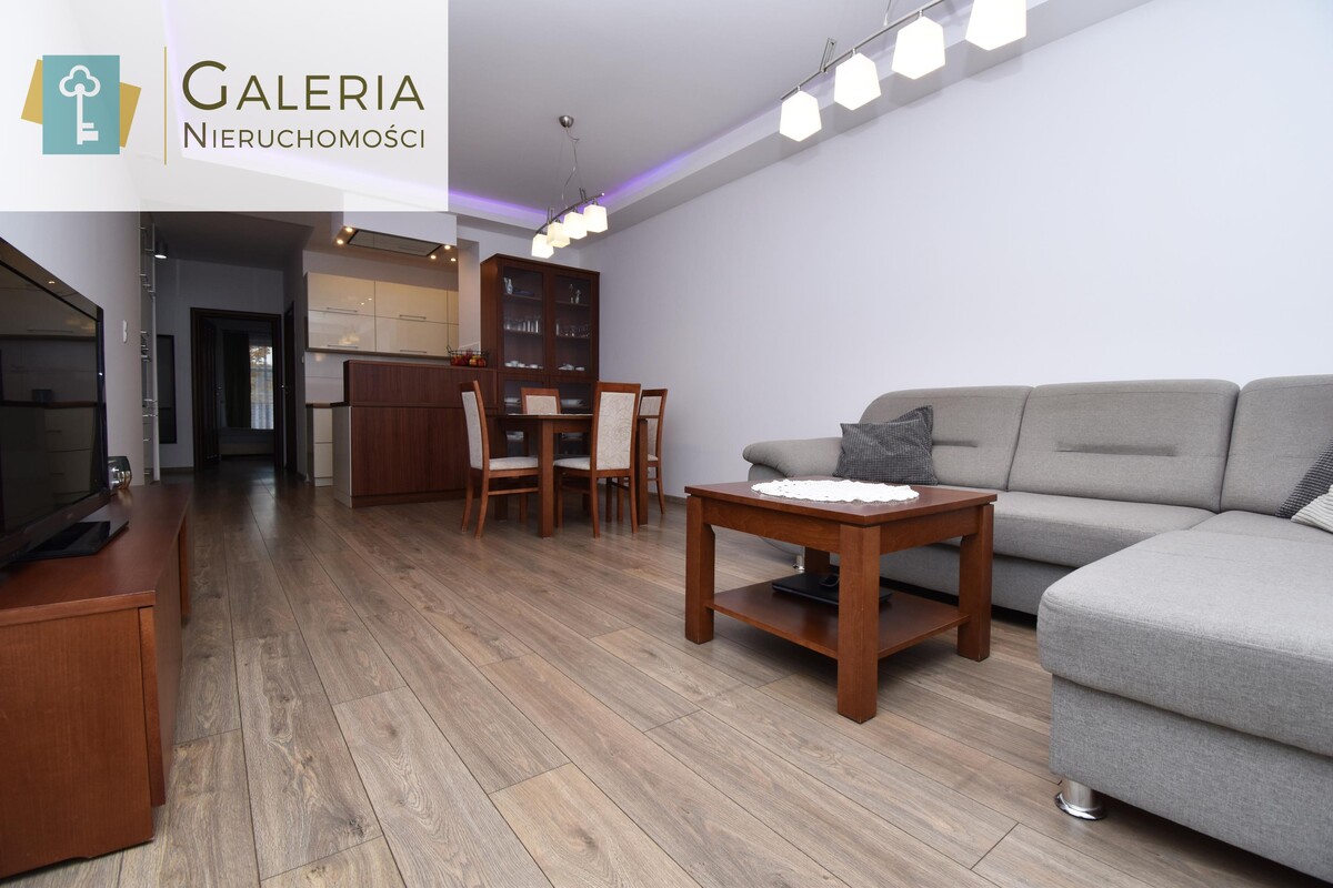 - Sypialnia - elegancka i przytulna, wyposażona w duże łóżko z materacem oraz szafki nocne. W sypialni znajdują się dwie duże, bardzo pojemne szafy, które zapewniają mnóstwo miejsca do przechowywania. Z sypialni można wyjść na balkon, z którego widok jest na Galerię El.