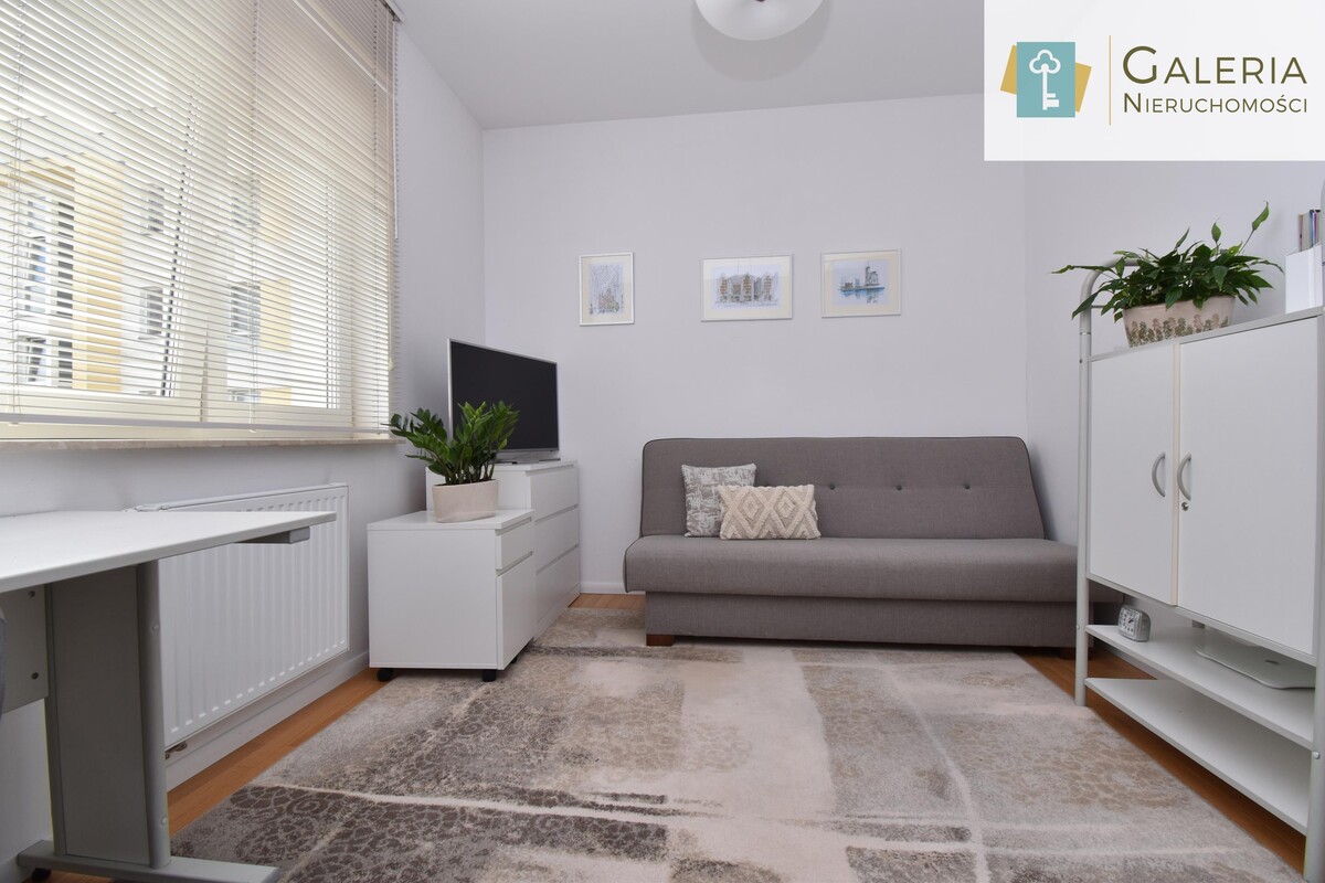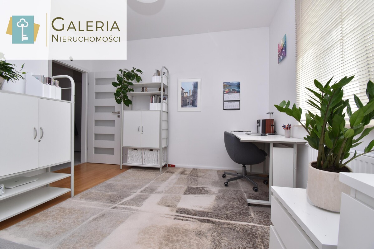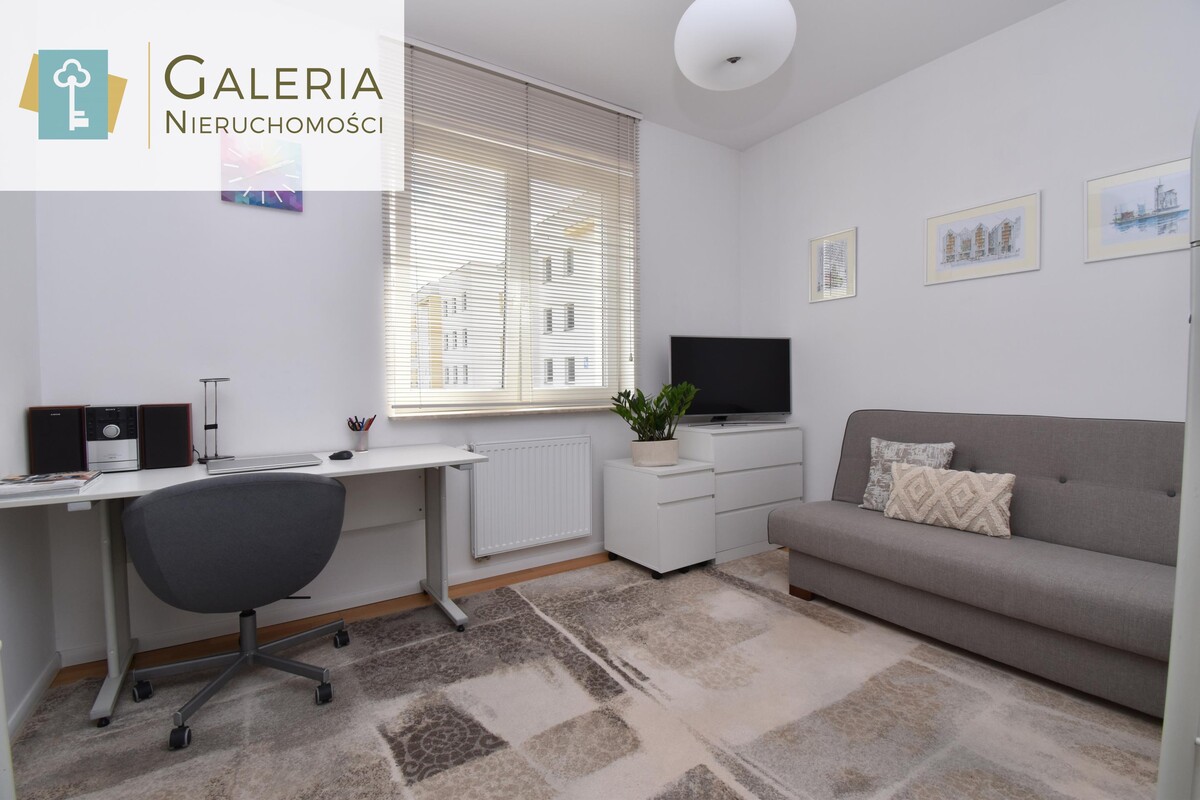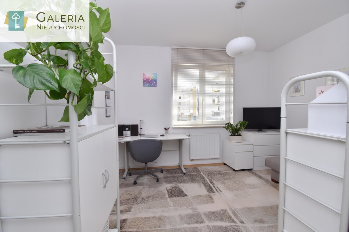 Sypialnia (obecnie pełniąca funkcję gabinetu) została wyposażona w biurko, praktyczne regały, komody oraz miejsce do spania. Pomieszczenie daje możliwość łatwej aranżacji na komfortową sypialnię z dużym łóżkiem.