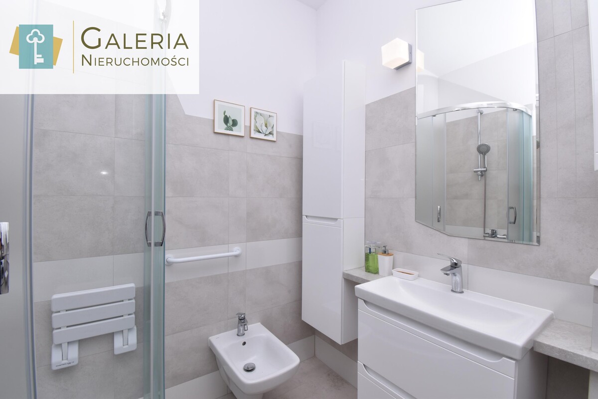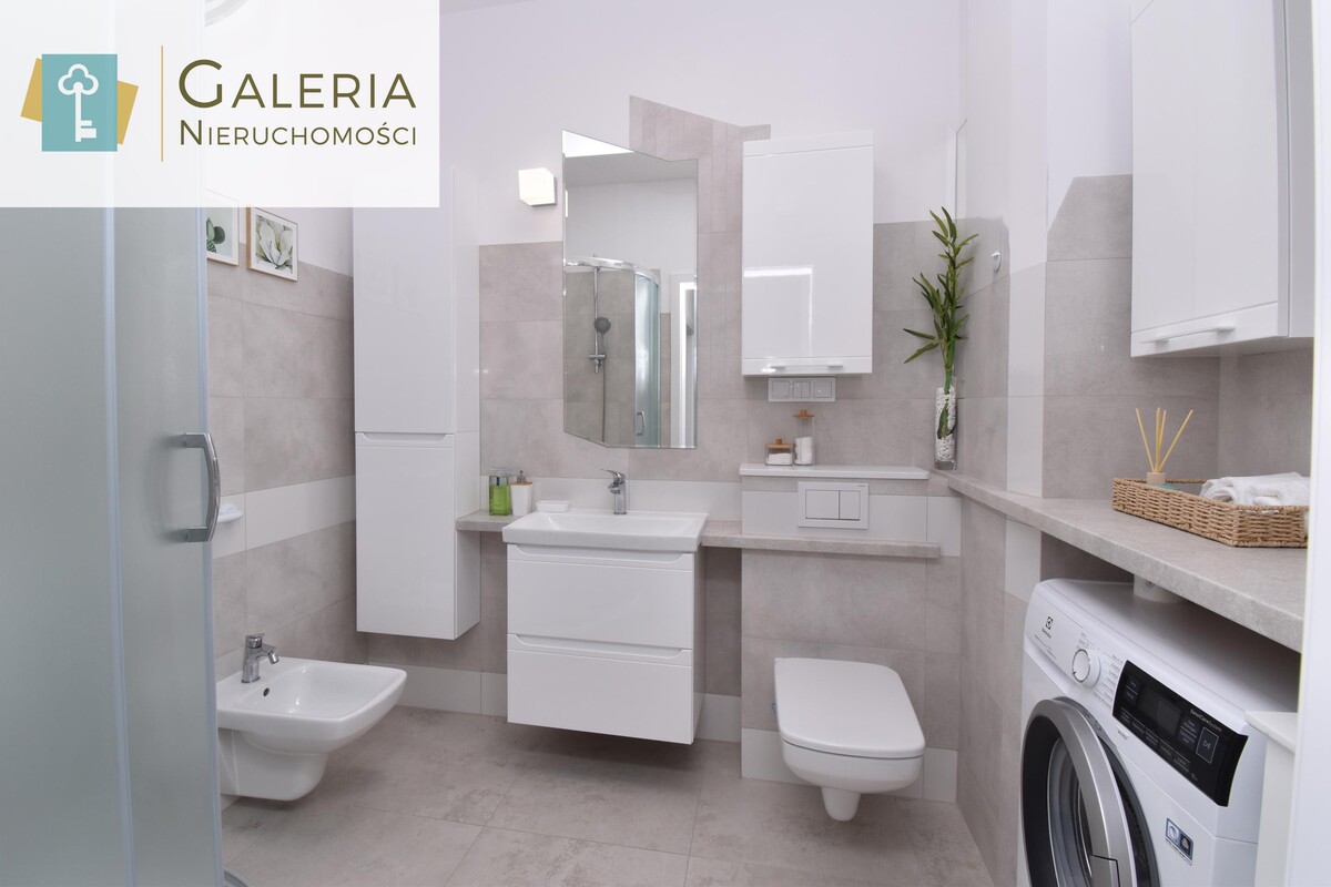Łazienka to eleganckie i praktyczne wnętrze, wyposażone w kabinę prysznicową z siedziskiem, umywalkę z szafką, bidet oraz WC w zabudowie podtynkowej. Dodatkowe szafki i półki zapewniają dużo miejsca do przechowywania. Na wyposażeniu znajduje się również pralka.