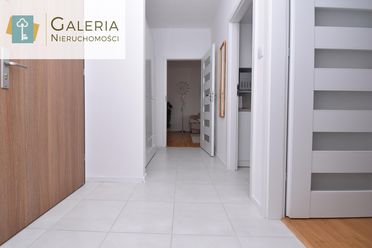 Przedpokój jest jasny i przestronny, wyposażony w pojemną szafę oraz dodatkowy regał, co ułatwia organizację przestrzeni.