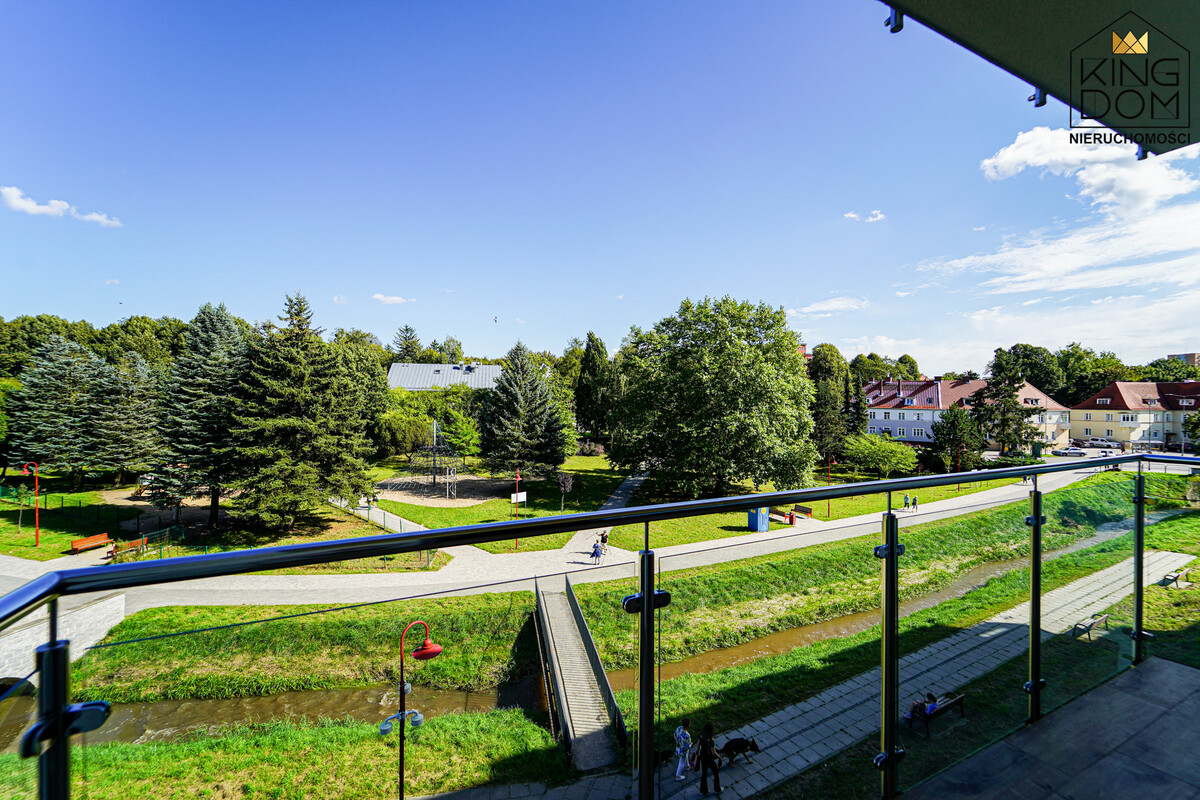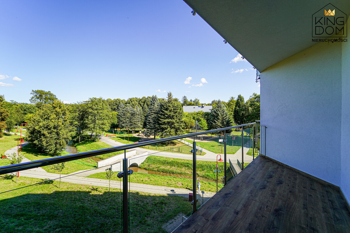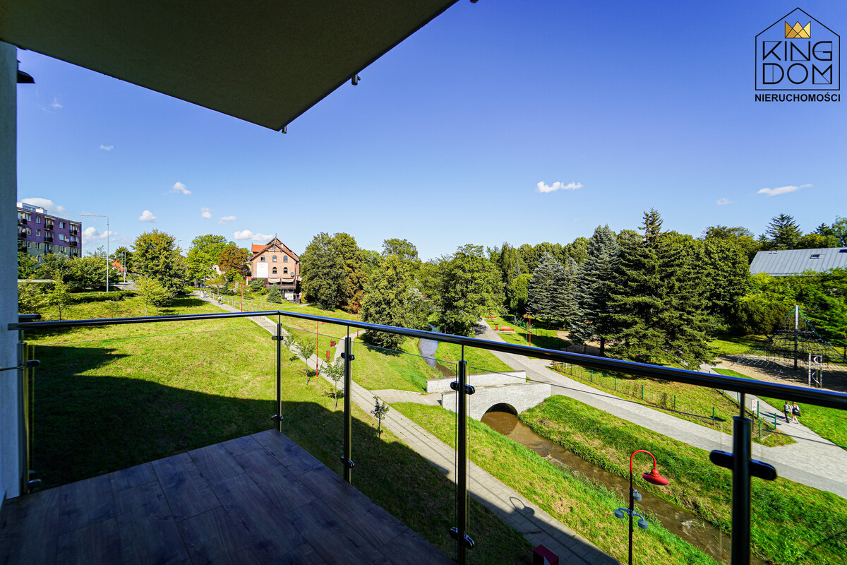 - przestronny salon z aneksem kuchennym w zabudowie ze sprzętami AGD (lodówka, piekarnik, płyta indukcyjna, zmywarka, okap) oraz wyjściem na balkon z widokiem na park,
