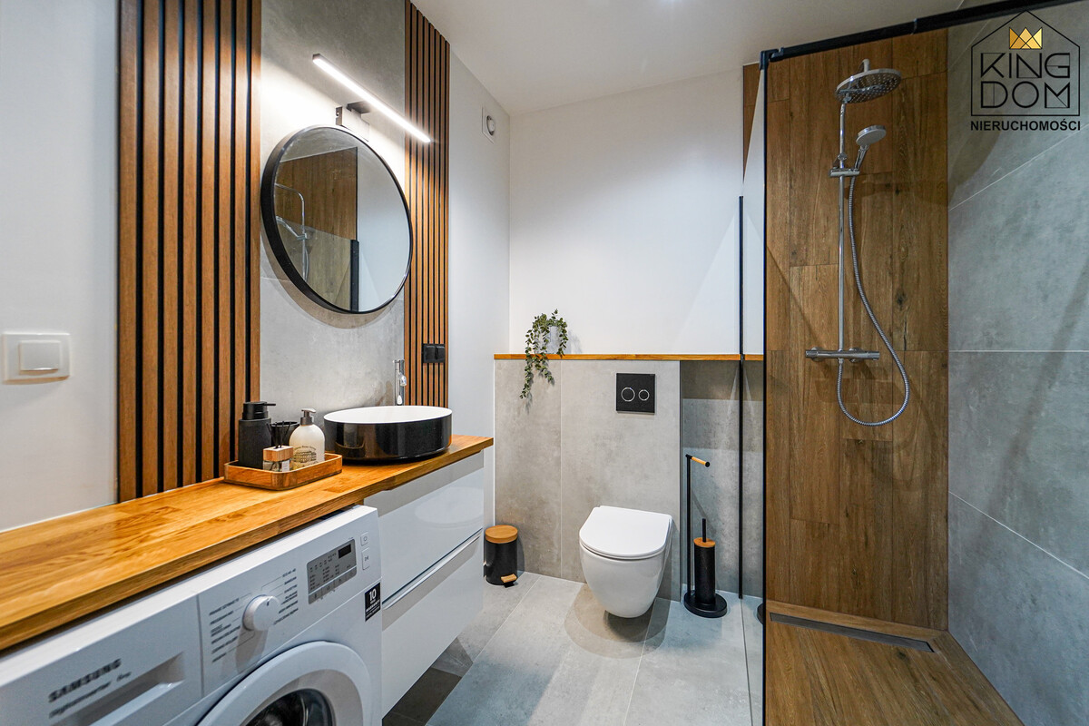 - łazienka z kabiną prysznicową typu walk-in, wc oraz pralką,