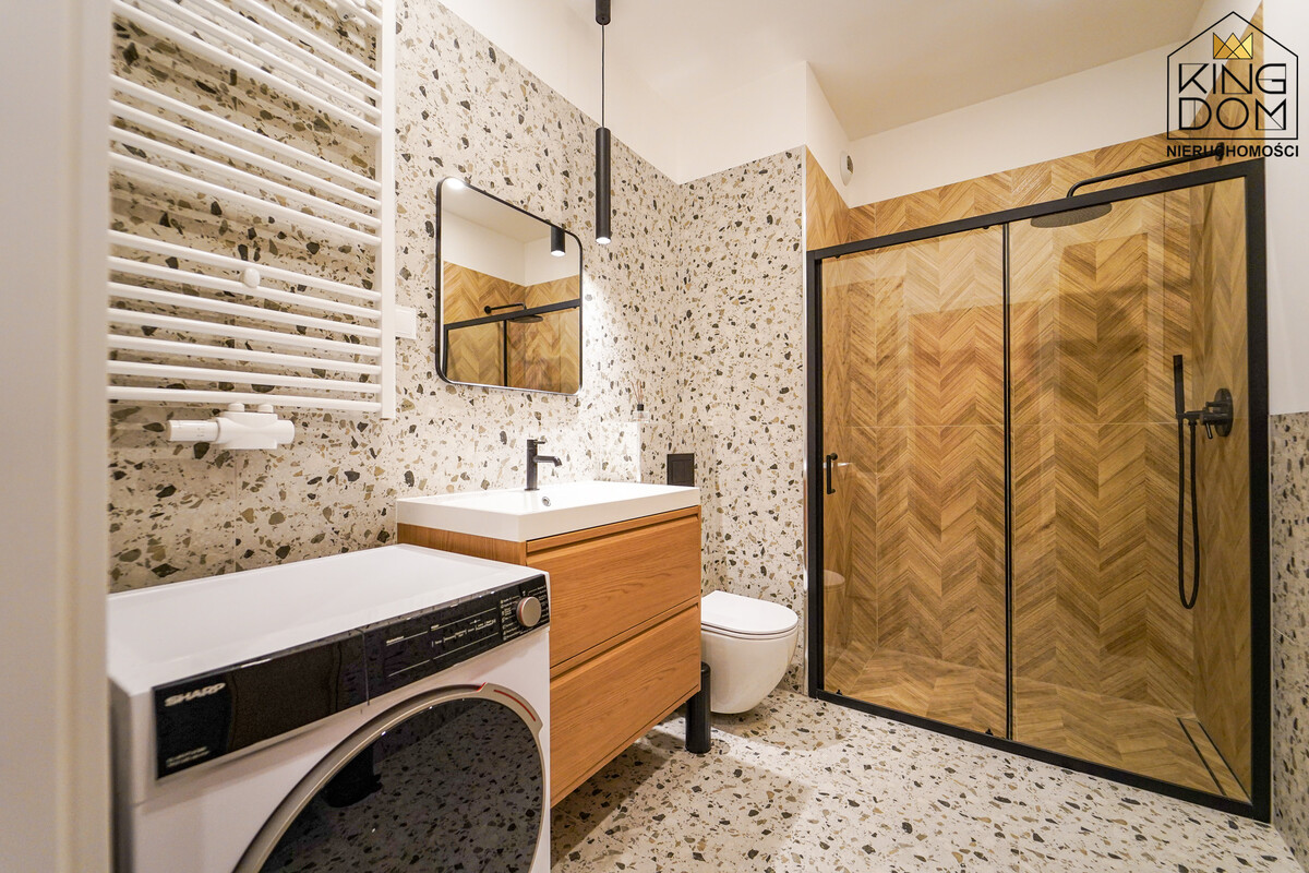 - komfortowa łazienka z prysznicem, wc oraz pralką,