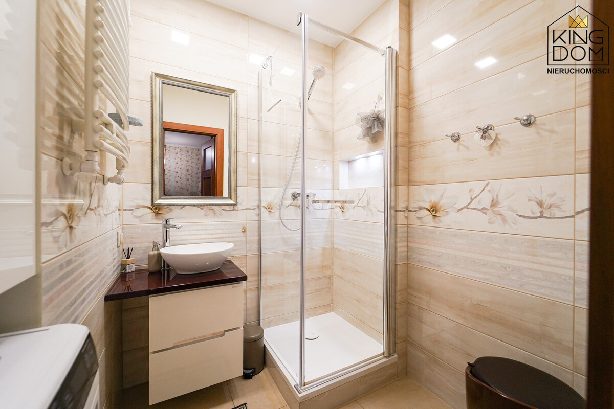 - łazienka z kabina prysznicową i pralką,