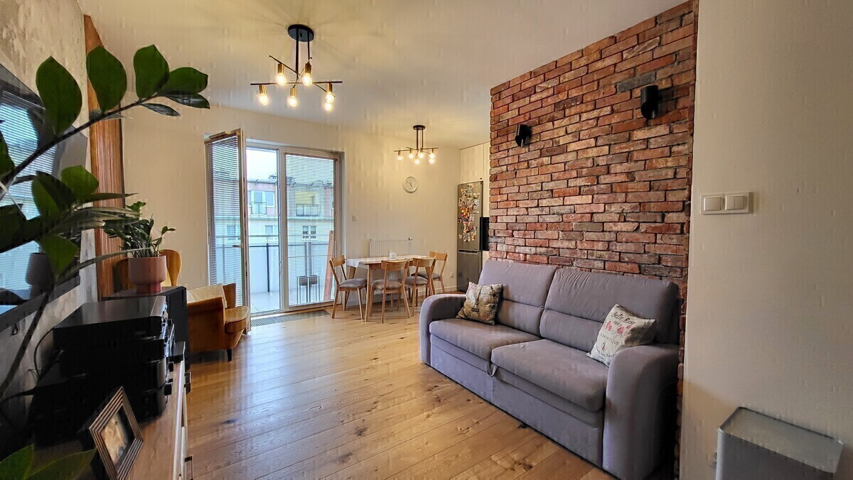 Na powierzchnię 55,41 m2 składają się trzy pokoje, półotwarta widna kuchnia, łazienka z wc i przedpokój. Posiada duży balkon od strony zachodniej. Mieszkanie zostało wykończone w wysokim standardzie, podłogi drewniane, solidne drzwi DRE, podgrzewana podłoga w łazience. W cenie jest zabudowa kuchni (drewniana, fronty fornirowane) z piekarnikiem, płytą indukcyjną, zmywarką i lodówką. W sypialni i przedpokoju szafa w zabudowie.