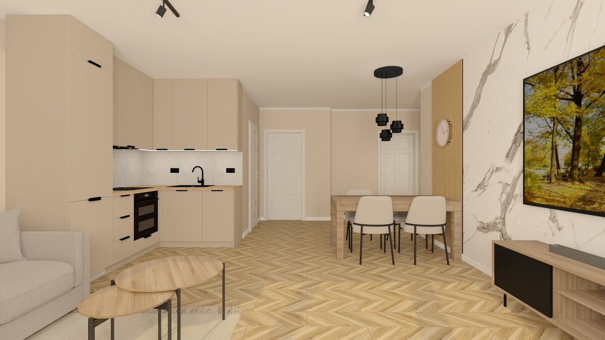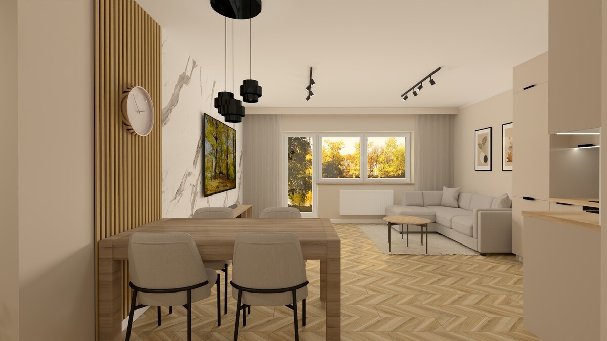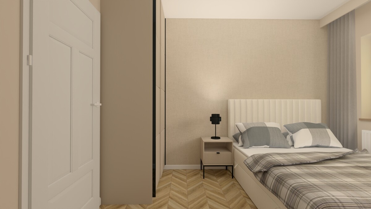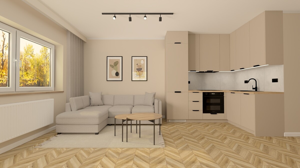 Lokal składa się z salonu połączonego z aneksem kuchennym, 2 odrębnych sypialni, łazienki z wc i przedpokoju.