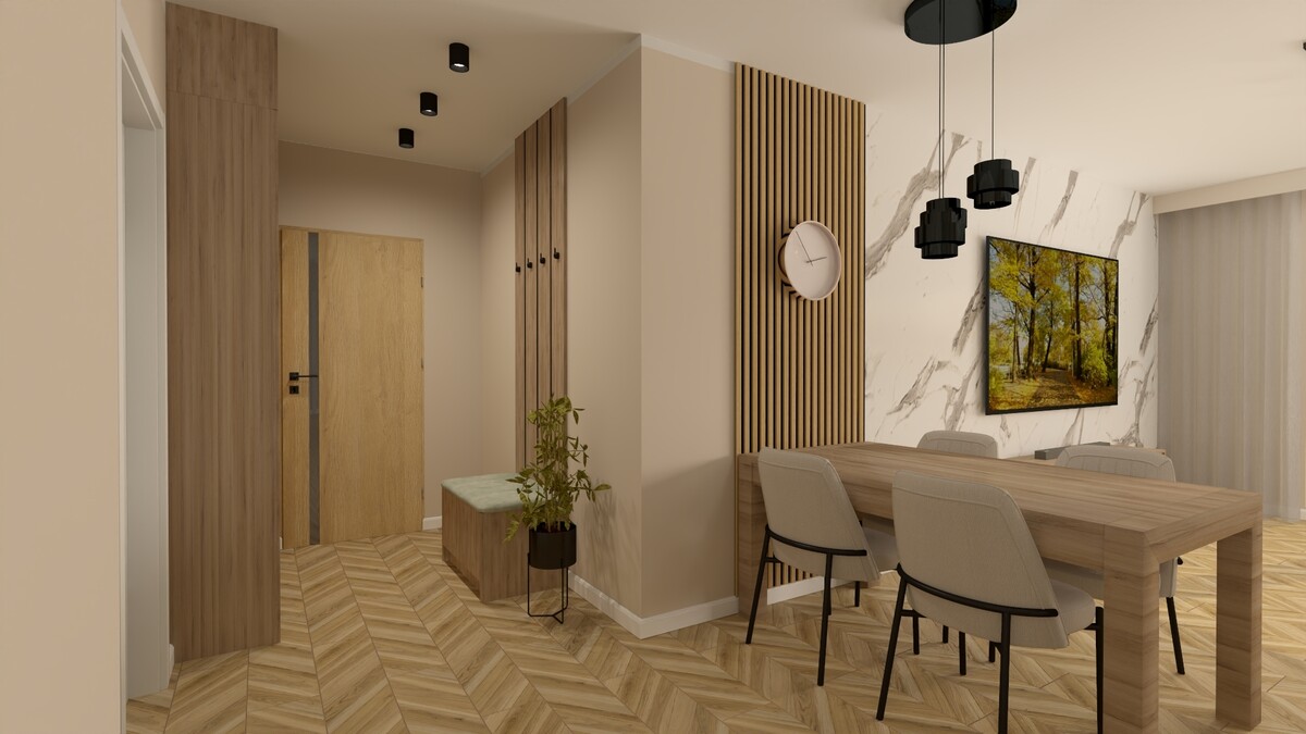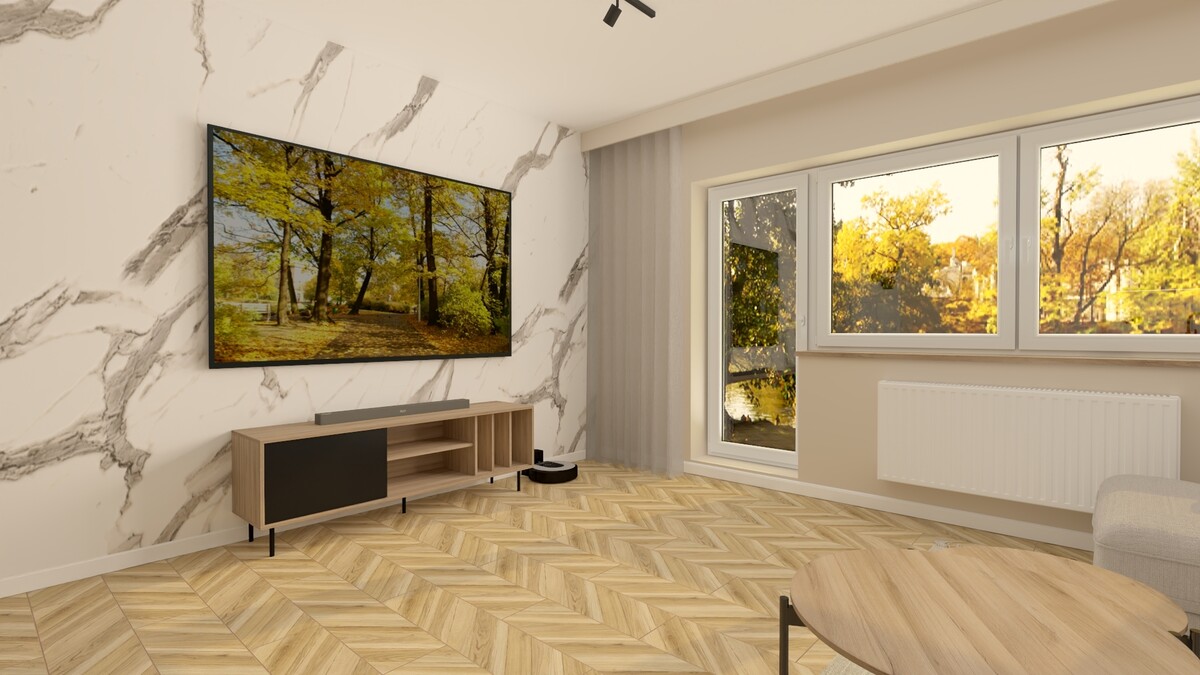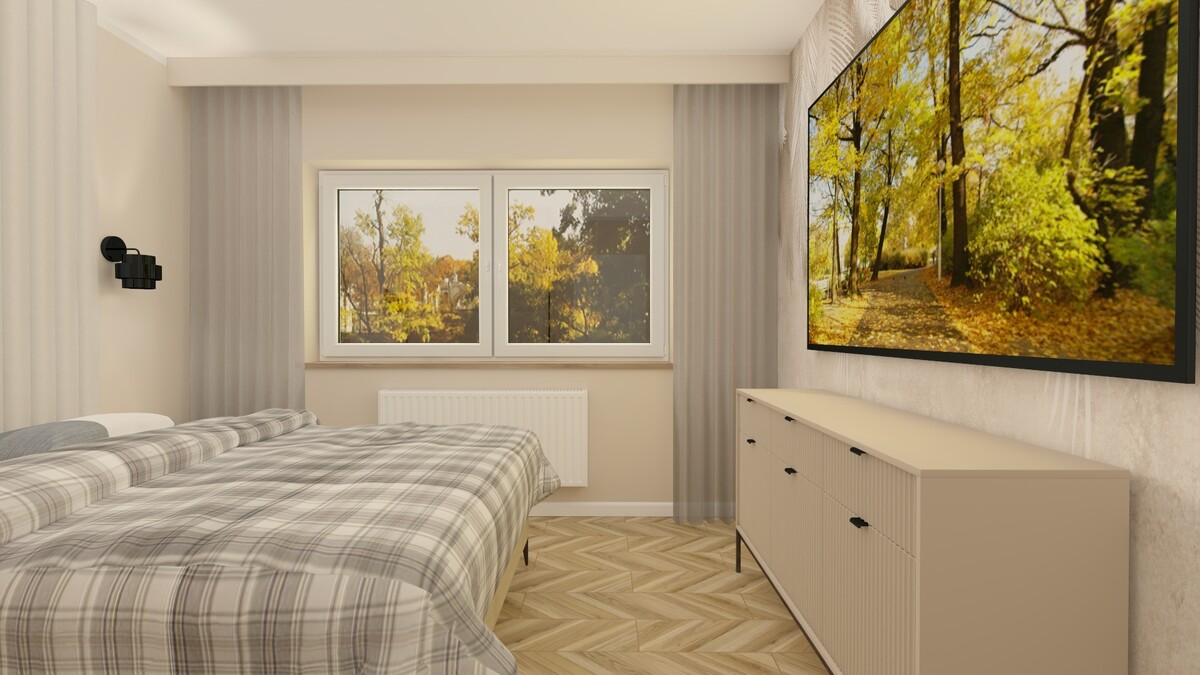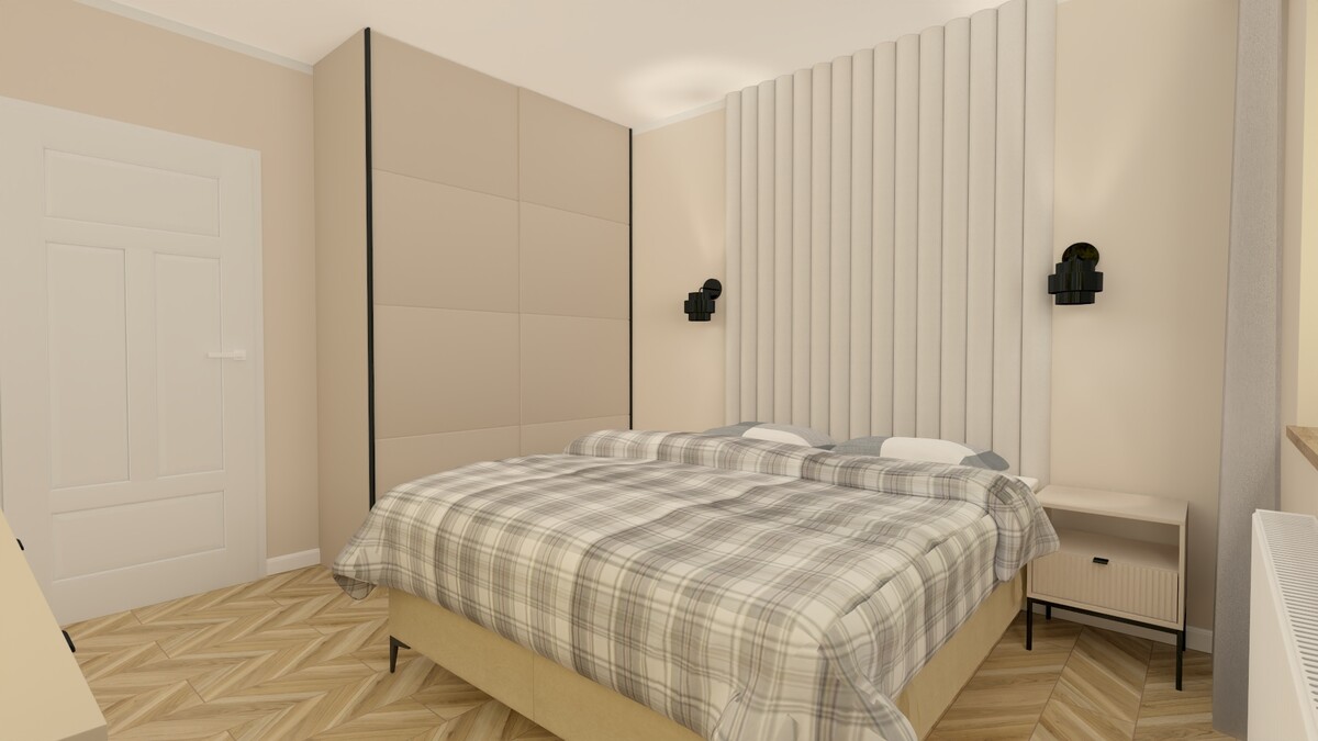 Lokal składa się z salonu połączonego z aneksem kuchennym, 2 odrębnych sypialni, łazienki z wc i przedpokoju.