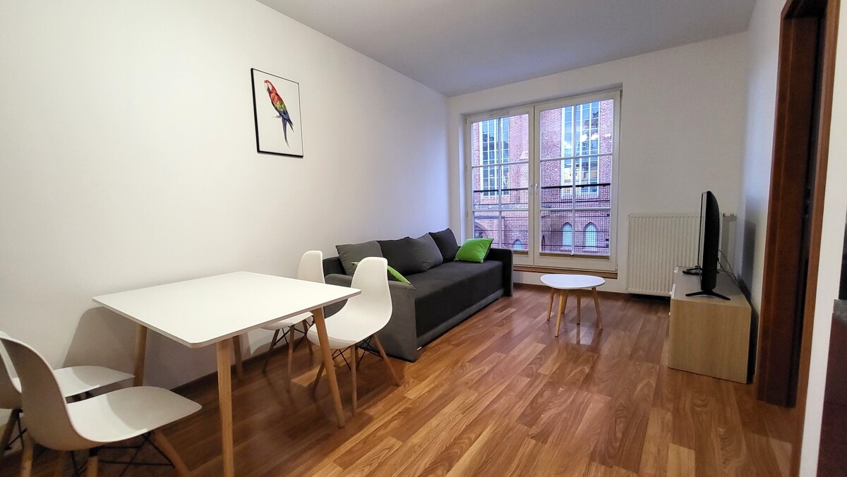 Mieszkanie jest umeblowane i wyposażone. Aneks kuchenny w zabudowie ze sprzętem AGD (lodówka, płyta grzewcza, piekarnik), w salonie kanapa, stół z krzesłami, szafa w zabudowie, w sypialni łóżko.