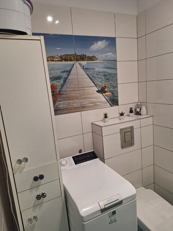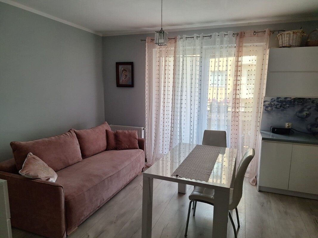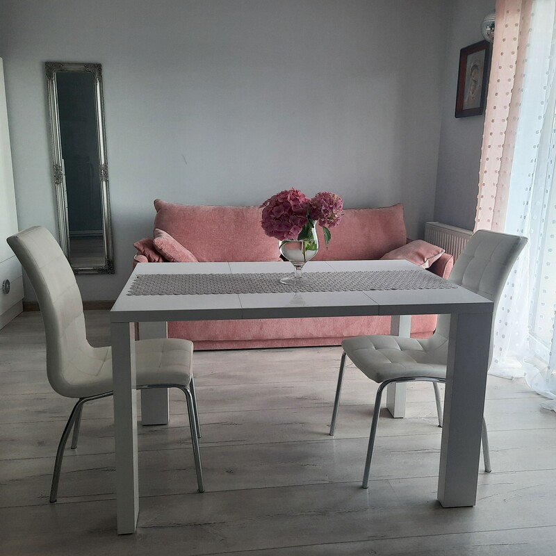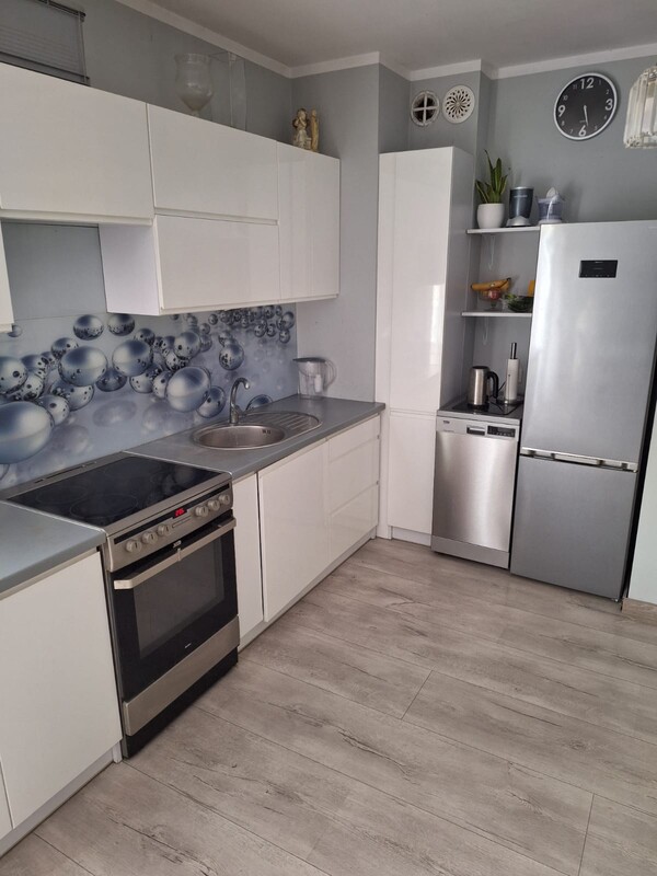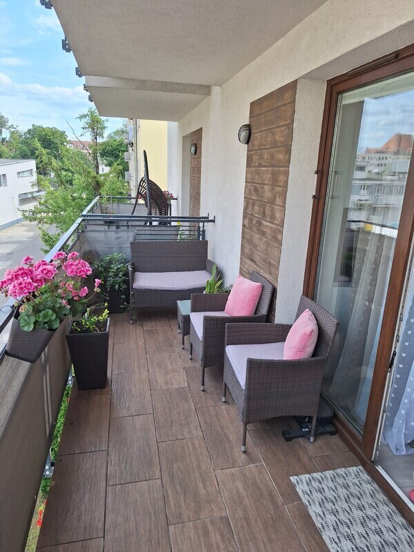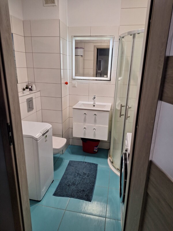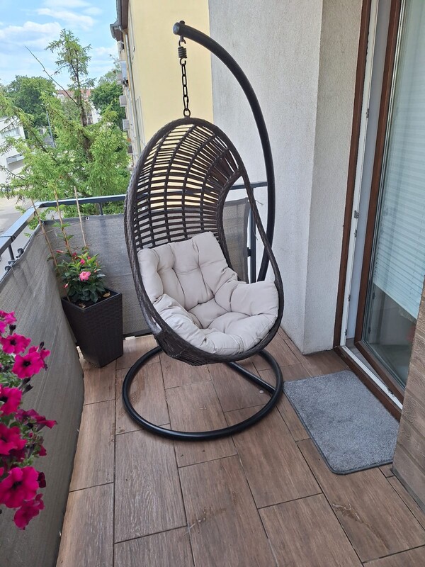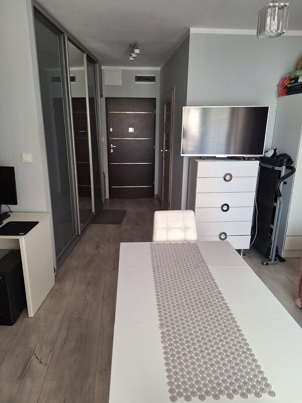 - Nowoczesny układ – przestronny, jasny salon z wyjściem na duży balkon, aneks kuchenny z wyposażeniem, sypialnia (mniejszy pokój) z wyjściem na drugi balkon, nowoczesna łazienka z kabiną prysznicową, przedpokój z zabudowaną dużą szafą.