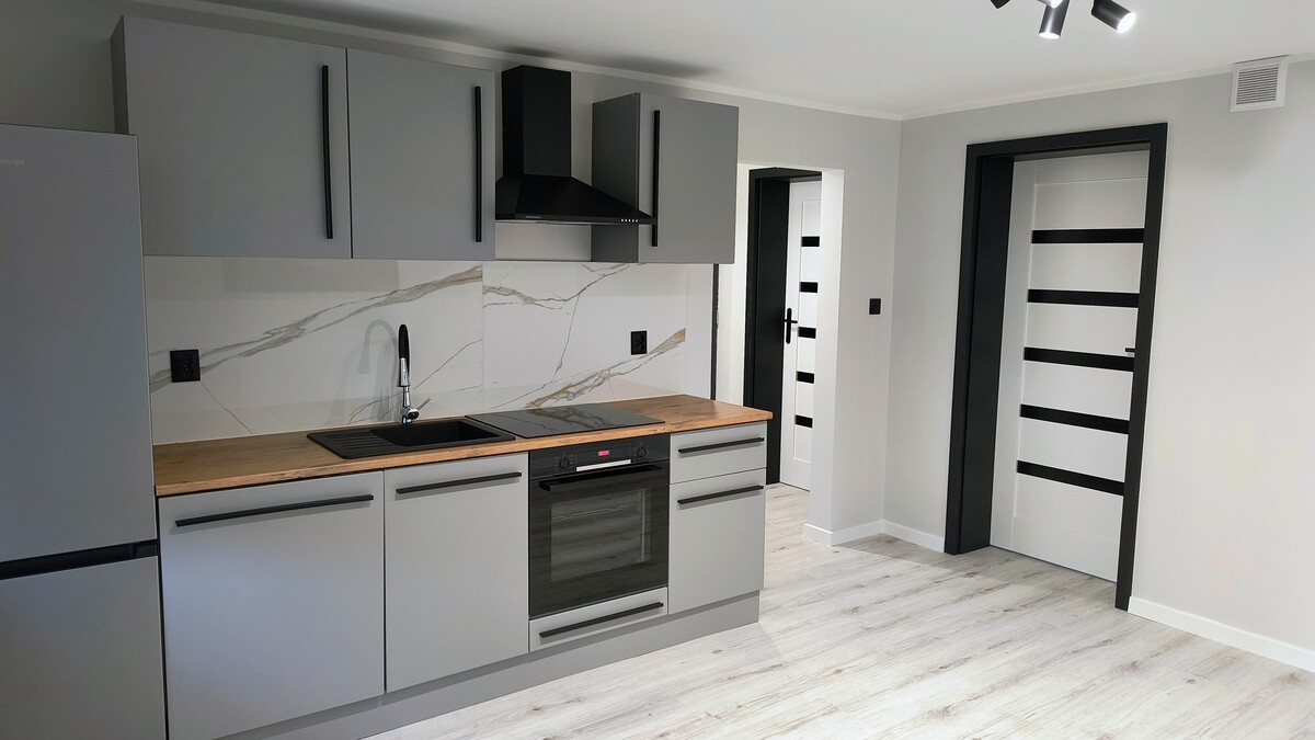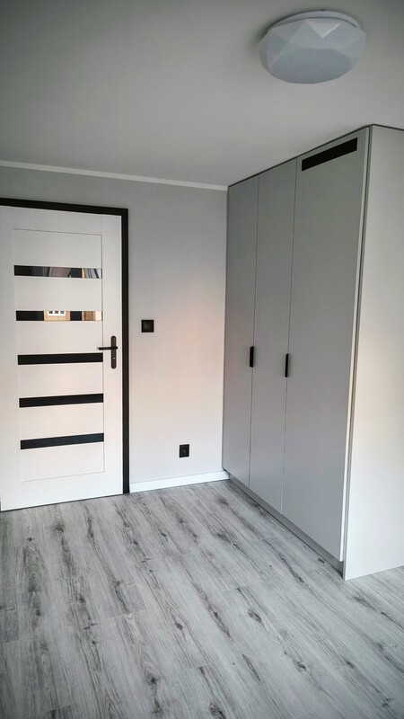 Mieszkanie składa się z przestronnego salonu z aneksem kuchennym, dwóch sypialni, łazienki z prysznicem oraz przedpokoju. Całość została wykonana z dbałością o każdy detal – wnętrze jest nowoczesne, jasne i bardzo funkcjonalne. W kuchni znajdują się nowe meble w zabudowie oraz kompletny sprzęt AGD (lodówka, piekarnik, płyta, okap, zmywarka). W jednej z sypialni wykonano pojemną szafę w zabudowie, która zapewnia dużo miejsca do przechowywania.
