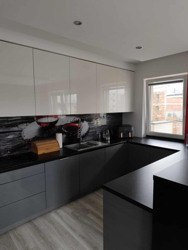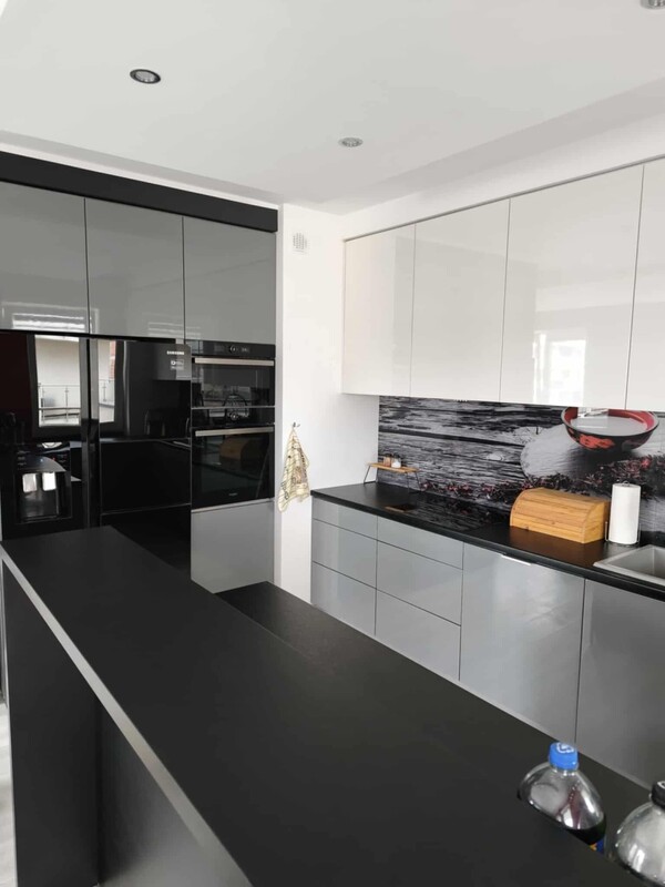 - Kuchnia robiona na wymiar, w tym wysokiej klasy sprzęty AGD: Lodówka Side-by-Side Samsung z wbudowana kostkarką do lodu i filtrowaną zimną wodą, zmywarka 60 cm firmy Ariston, Płyta indukcyjna marki Amica, Kuchenka mikrofalowa i piekarnik 6th sense firmy Elektrolux.