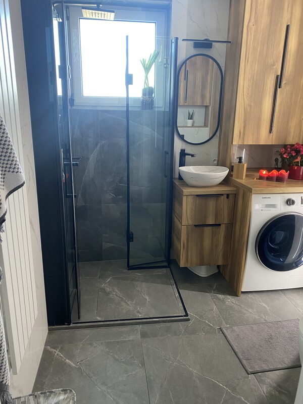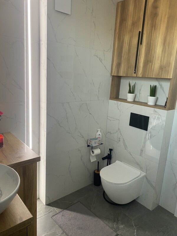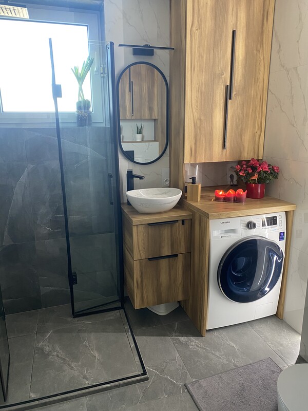 • łazienka z oknem, z kabiną walk in i toaletą z zestawem podtynkowym WC oraz bidetką, w zabudowie meblowej oraz pralko suszarka w zabudowie.