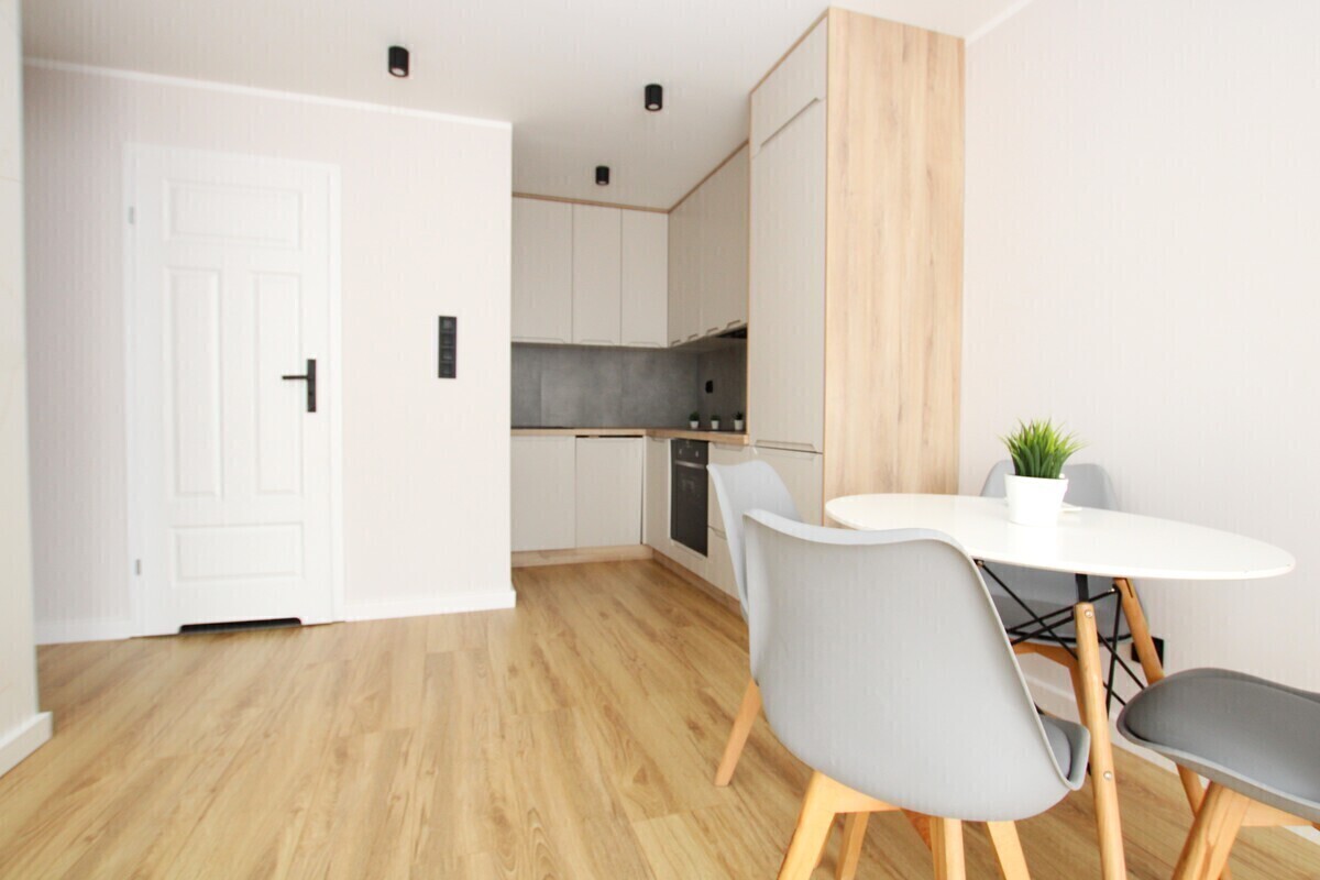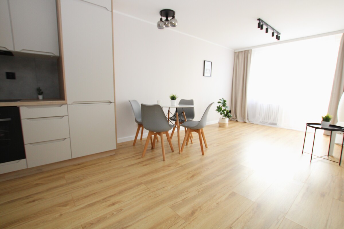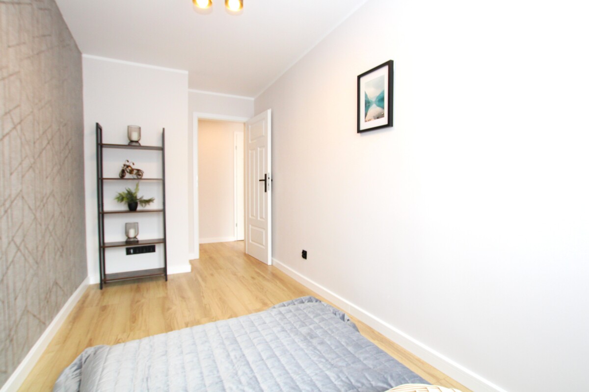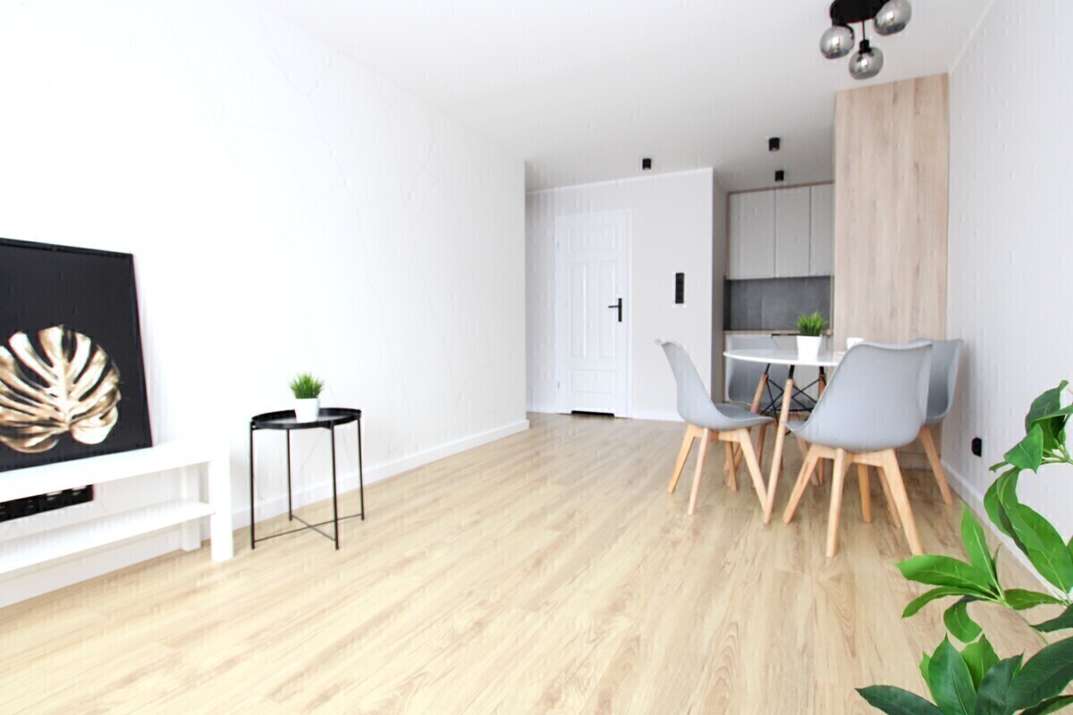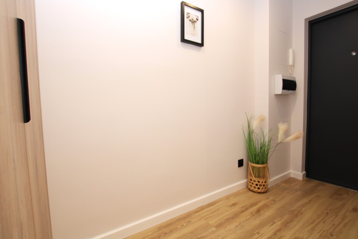 Mieszkanie o wysokim standardzie, nowocześnie i zaaranżowane według indywidualnego projektu. W pokojach na podłodze panele, stolarka okienna PCV, nowe podłogi, gładzie na ścianach. Łazienka z nowoczesną kabiną prysznicową, gres i terakota w modnych odcieniach czerni, drewna i bieli. Zaprojektowana przestrzeń dzienna, którą tworzy salon z aneksem kuchennym stanowi bardzo funkcjonalne rozwiązanie dla miejsca na jadalnię i strefę wypoczynkową. Oddzielna sypialnia. Nowa zabudowa kuchni oraz duża szafa w przedpokoju w cenie mieszkania.