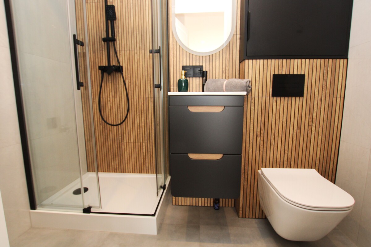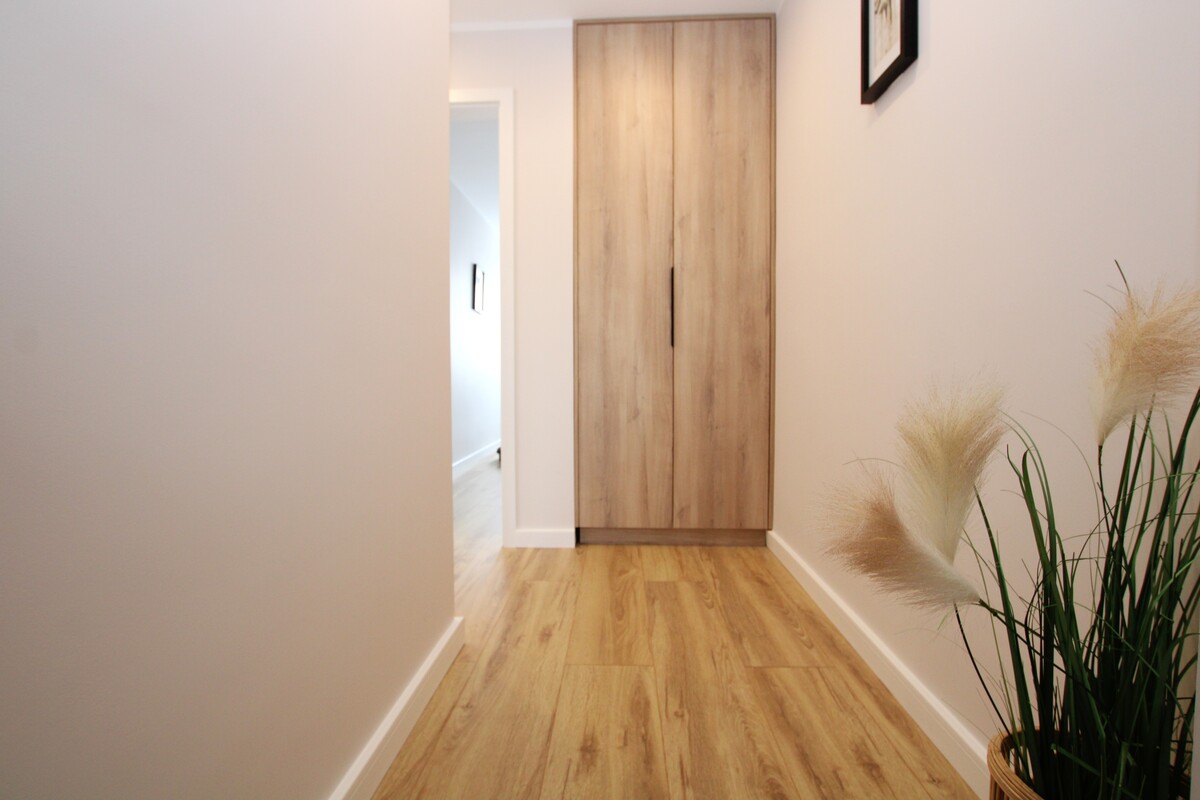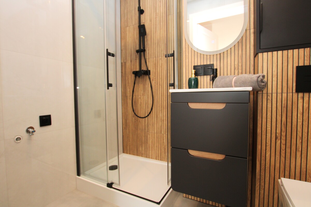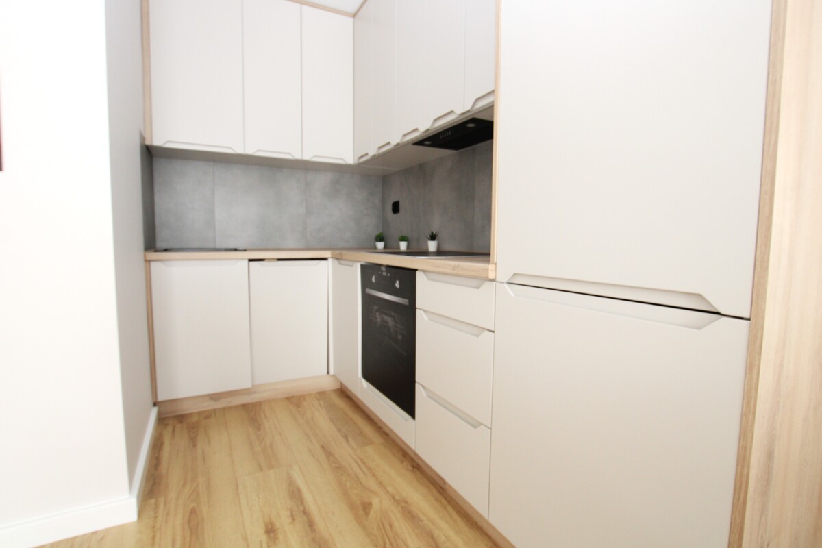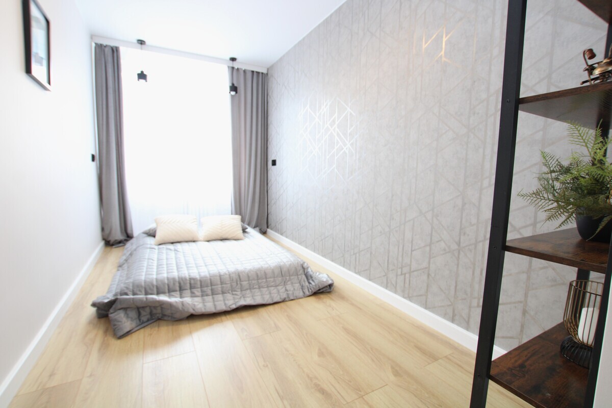 Mieszkanie o wysokim standardzie, nowocześnie i zaaranżowane według indywidualnego projektu. W pokojach na podłodze panele, stolarka okienna PCV, nowe podłogi, gładzie na ścianach. Łazienka z nowoczesną kabiną prysznicową, gres i terakota w modnych odcieniach czerni, drewna i bieli. Zaprojektowana przestrzeń dzienna, którą tworzy salon z aneksem kuchennym stanowi bardzo funkcjonalne rozwiązanie dla miejsca na jadalnię i strefę wypoczynkową. Oddzielna sypialnia. Nowa zabudowa kuchni oraz duża szafa w przedpokoju w cenie mieszkania.