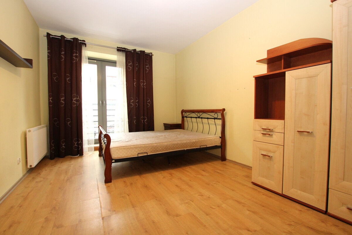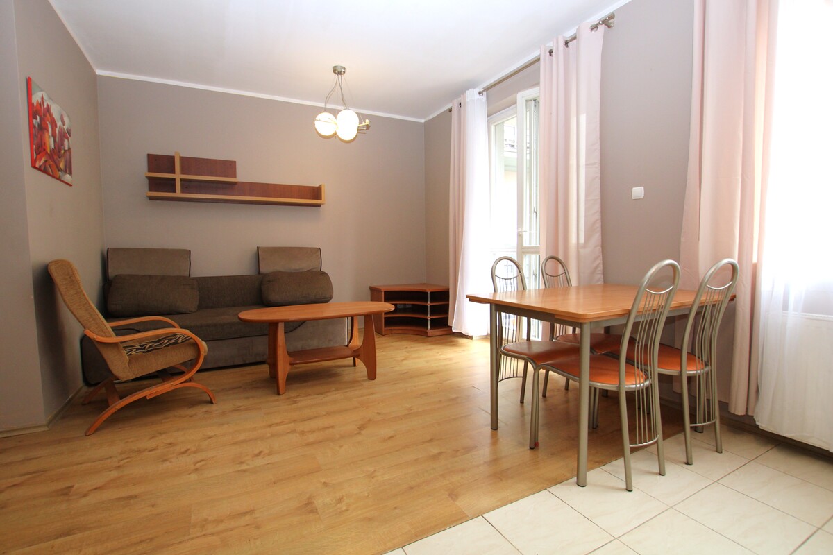Mieszkanie 2-pokojowe o powierzchni 56 m2, składające się z otwartego pokoju dziennego z aneksem kuchennym, z dużym balkonem, odrębnej wygodnej sypialni, łazienki z wc, przedpokoju oraz schowka gospodarczego. Lokal umeblowany oraz wyposażony w niezbędne sprzęty AGD tj. lodówka, pralka, zmywarka. Łazienka z kabiną prysznicową pokryta glazurą i terakotą, obszerna szafa garderobiana w przedpokoju. Usytuowane w kamienicy z nowszych zasobów, położone na I piętrze. Oferta skierowana do osób pracujących, bez zwierząt.
