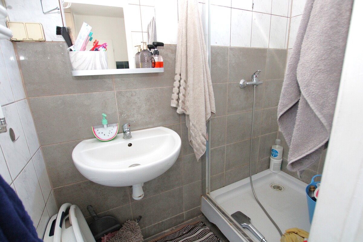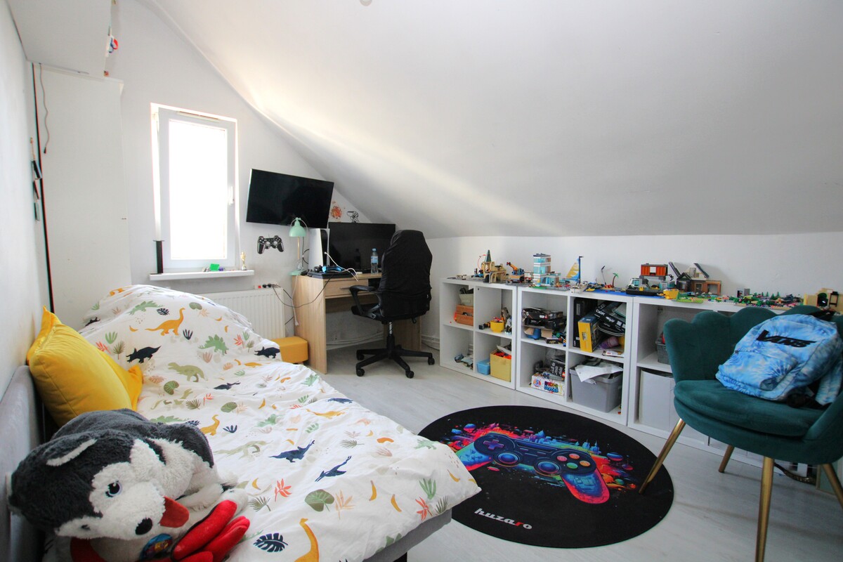 Jasne wnętrza: podłogi wykończone zostały jasnymi panelami, okna PCV oraz drewniane okna dachowe typu Velux gwarantują doskonałe doświetlenie. Odrębna toaleta wykończona została estetyczną glazurą i terakotą. Łazienka z oknem, czeka na Twój pomysł na remont.
