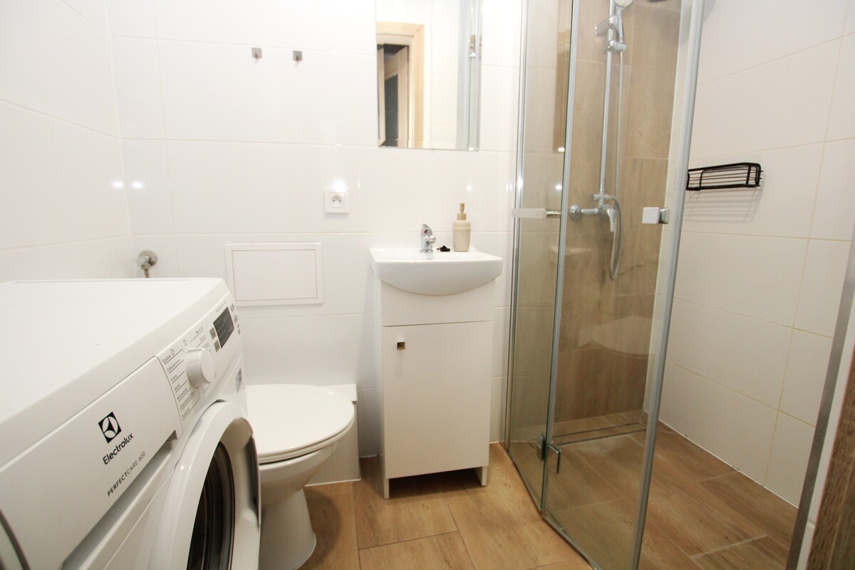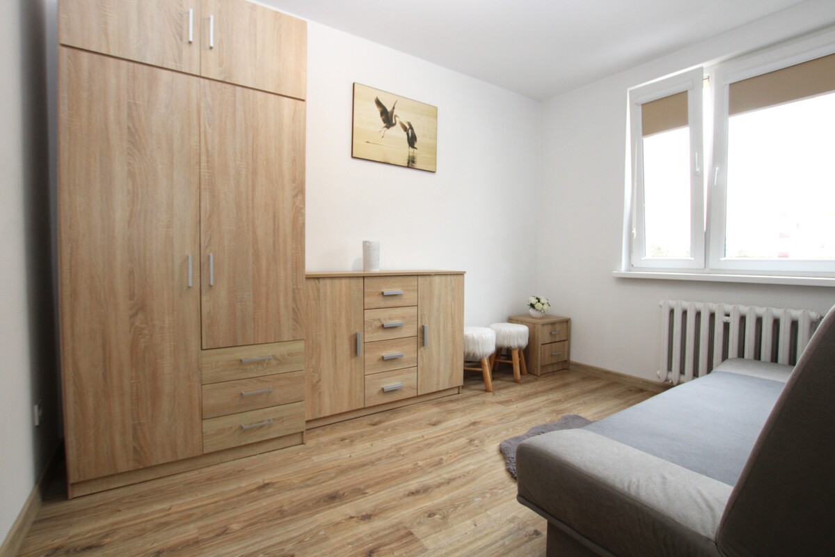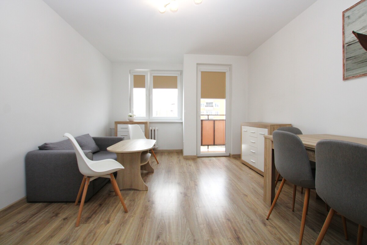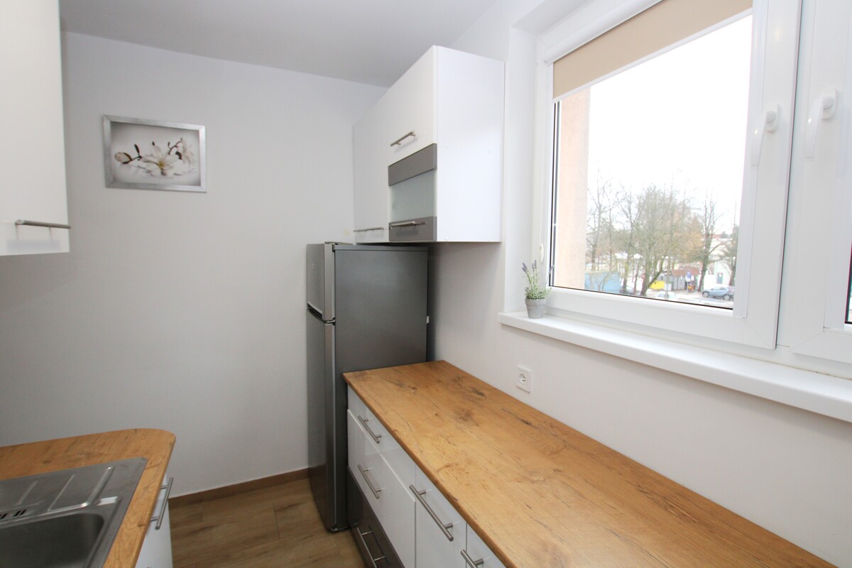 Pokój dzienny z balkonem, z obszerną szafa garderobianą. Nowa zabudowa kuchenna wraz ze sprzętem AGD: kuchenka z piekarnikiem, lodówka. Odrębna sypialnia. Ściany wycekolowane o jasnej kolorystyce, panele podłogowe, okna PCV z roletami wewnętrznymi. Funkcjonalny rozkład pomieszczeń, odrębne wejścia do każdego z pokoi. Nowocześnie wykończona łazienka, z kabiną prysznicową typu walk-in, pralką, urządzenia sanitarne w bardzo dobrym stanie. Doskonała lokalizacja, blisko centrum miasta, w pobliżu pełna infrastruktura, komunikacja miejska, sklepy, usługi, teatr, miasteczko handlowe przy ulicy Nowowiejskiej.