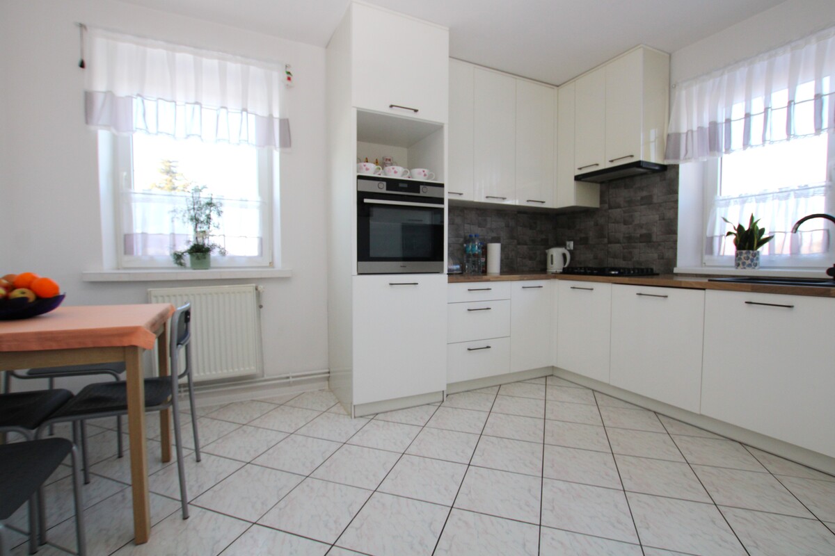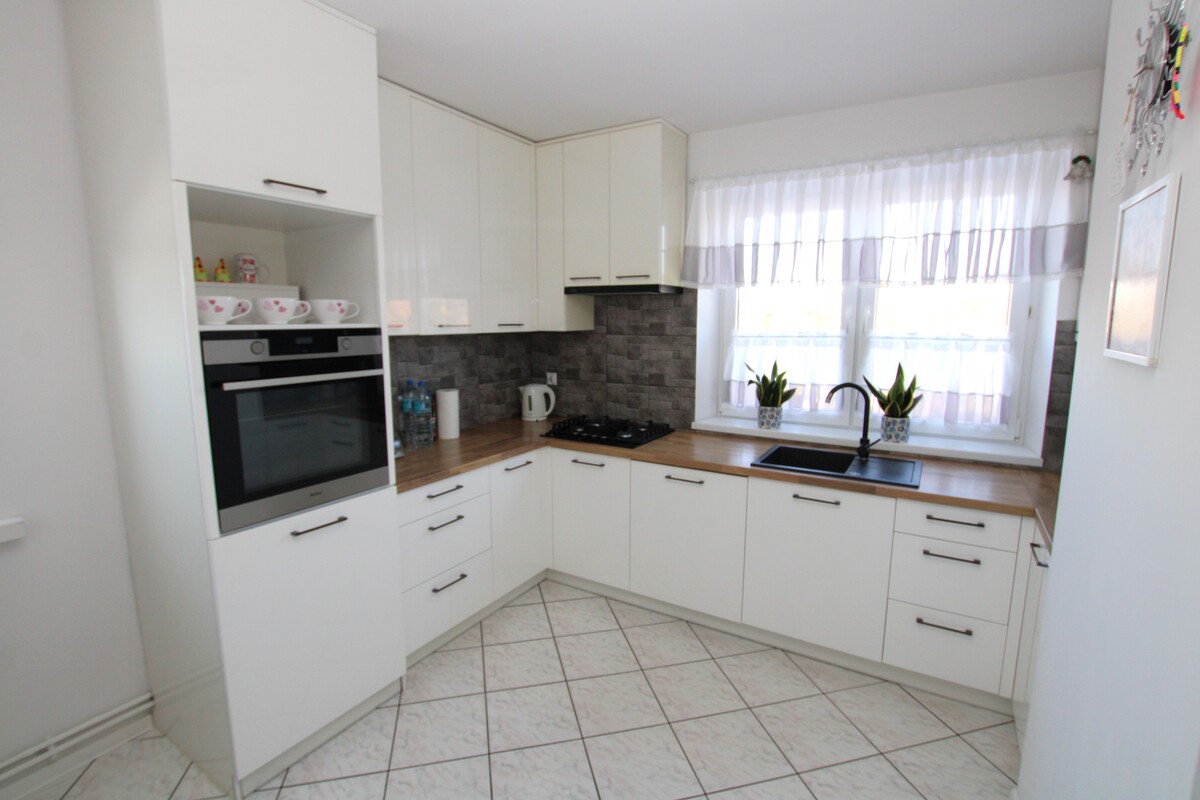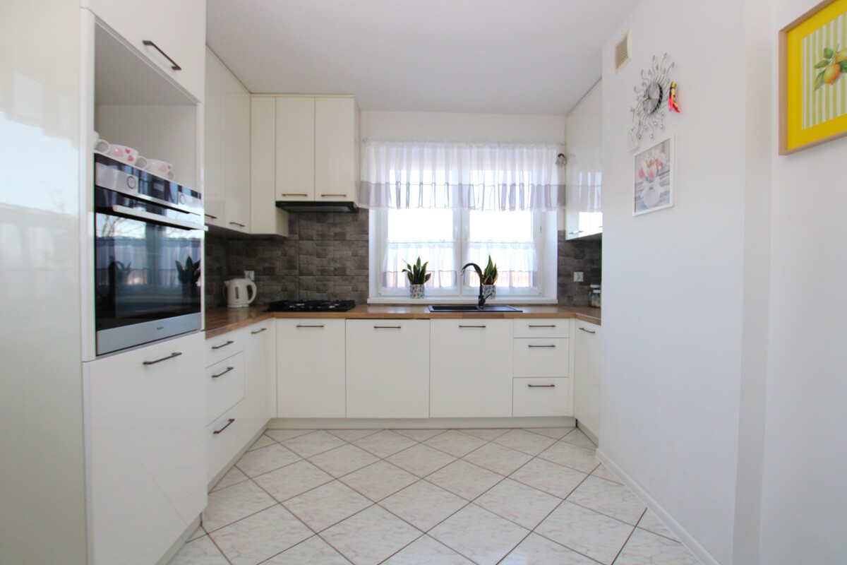 Mieszkanie o powierzchni 58 m2 zajmuje pierwsze piętro w kameralnym, dwurodzinnym budynku. Wnętrze zostało zaplanowane w sposób niezwykle funkcjonalny, zapewniając domownikom pełną wygodę. Centralnym punktem domu jest słoneczny salon o powierzchni około 20 m2,w którym znajduje się klimatyczny kominek grzewczy oraz wyjście na obszerny balkon. Dwie ustawne sypialnie, w tym jedna wyposażona w pojemną szafę wnękową, gwarantują prywatność, a duża, widna kuchnia z miejscem na stół jadalniany staje się naturalnym miejscem spotkań. W cenie lokalu pozostaje nowoczesna, biała zabudowa kuchenna wykonana na wymiar wraz z pełnym wyposażeniem AGD (zmywarka, lodówka, piekarnik, płyta, pralka). Łazienka z oknem, wyposażona w wannę, wykończona w schludnej glazurze.