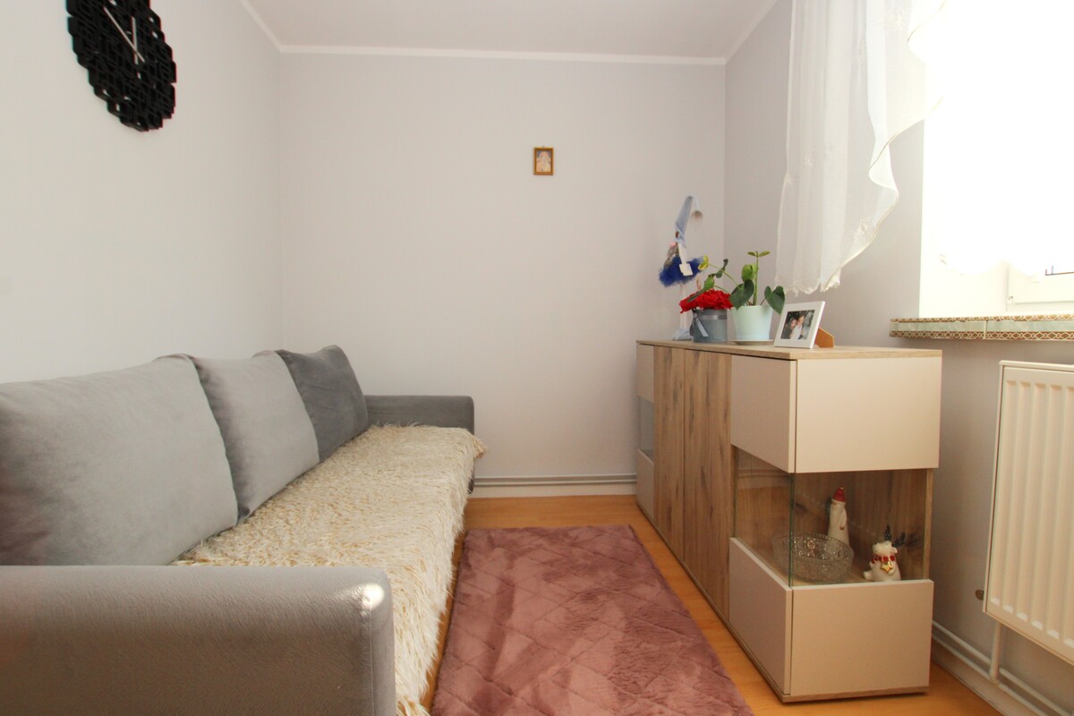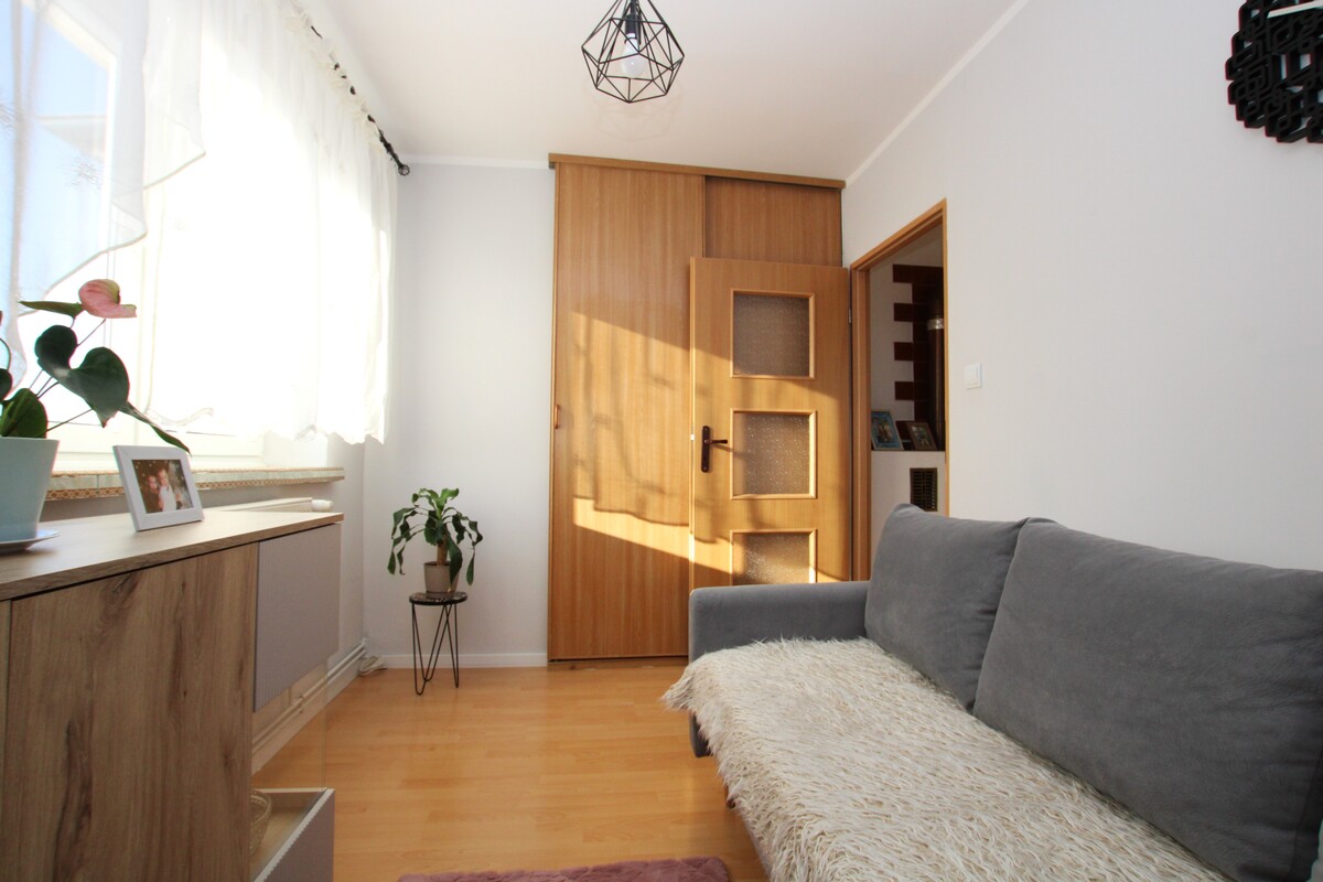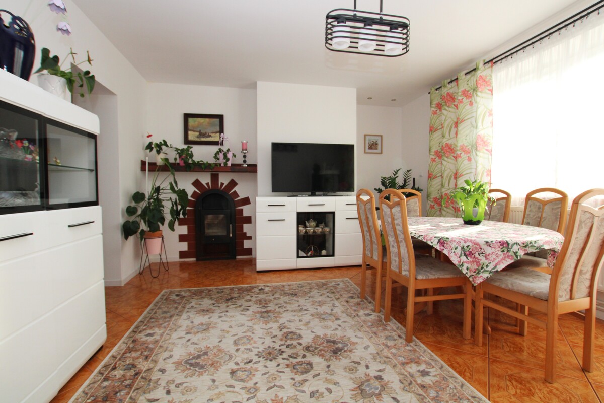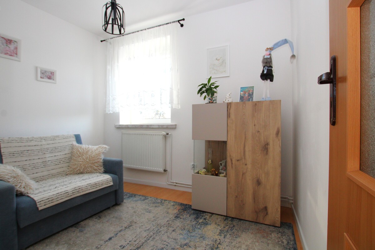 Mieszkanie o powierzchni 58 m2 zajmuje pierwsze piętro w kameralnym, dwurodzinnym budynku. Wnętrze zostało zaplanowane w sposób niezwykle funkcjonalny, zapewniając domownikom pełną wygodę. Centralnym punktem domu jest słoneczny salon o powierzchni około 20 m2,w którym znajduje się klimatyczny kominek grzewczy oraz wyjście na obszerny balkon. Dwie ustawne sypialnie, w tym jedna wyposażona w pojemną szafę wnękową, gwarantują prywatność, a duża, widna kuchnia z miejscem na stół jadalniany staje się naturalnym miejscem spotkań. W cenie lokalu pozostaje nowoczesna, biała zabudowa kuchenna wykonana na wymiar wraz z pełnym wyposażeniem AGD (zmywarka, lodówka, piekarnik, płyta, pralka). Łazienka z oknem, wyposażona w wannę, wykończona w schludnej glazurze.