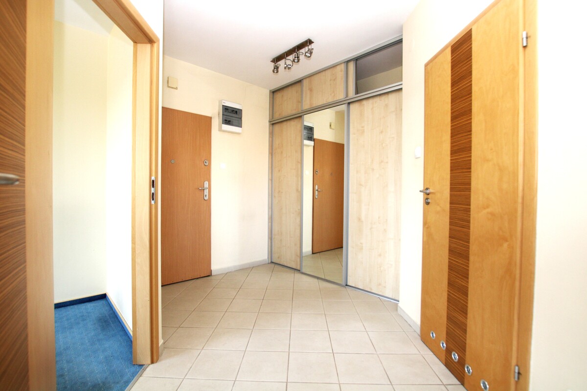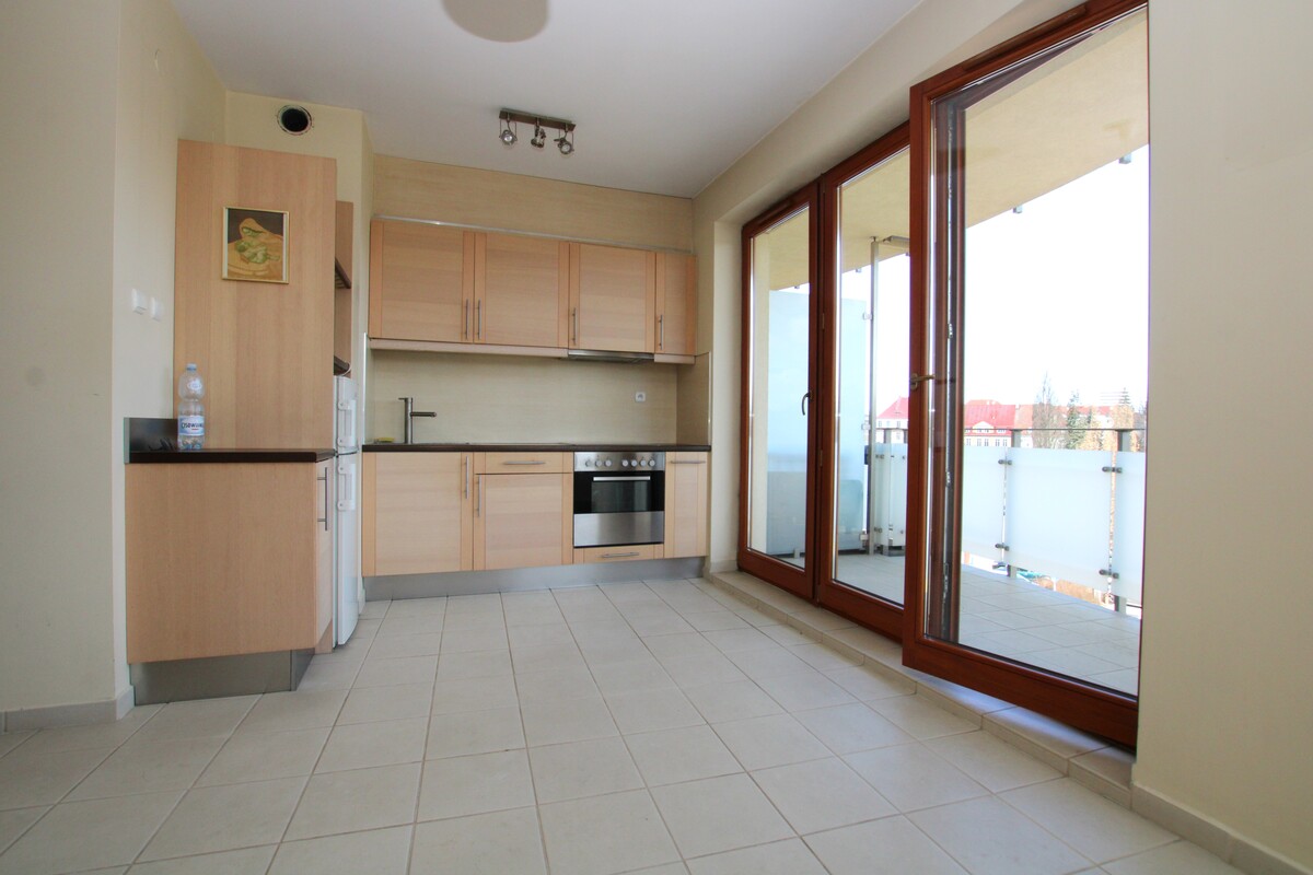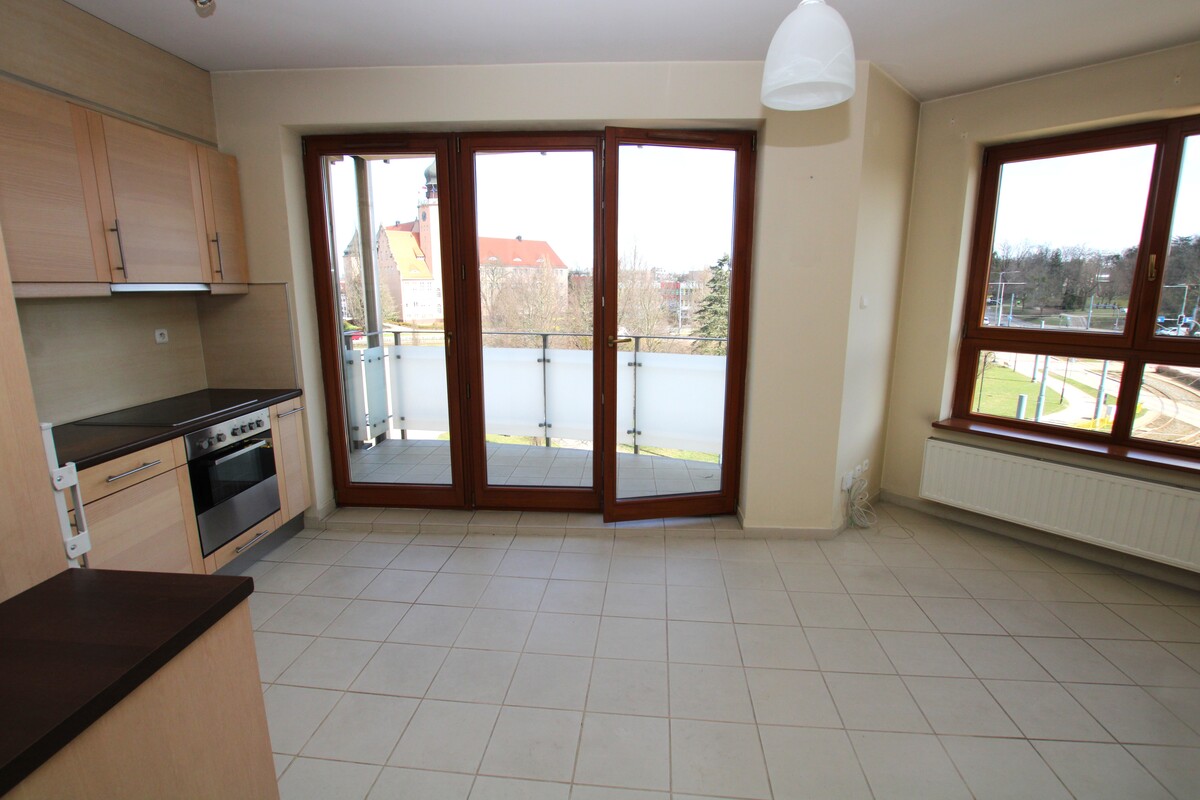 Lokal w bardzo dobrym stanie technicznym, z mediami miejskimi. Kuchnia ze sprzętem AGD, płyta elektryczna, okap, lodówka, piekarnik. Część dzienna z dużym balkonem z widokiem na panoramę miasta. Pokoje bez mebli, w przedpokoju duża szafa garderobiana z drzwiami suwanymi. W części dziennej ogrzewanie podłogowe. Duże okna w całym mieszkaniu doskonale rozświetlają pomieszczenia, urokliwy widok. Funkcjonalny rozkład pomieszczeń.